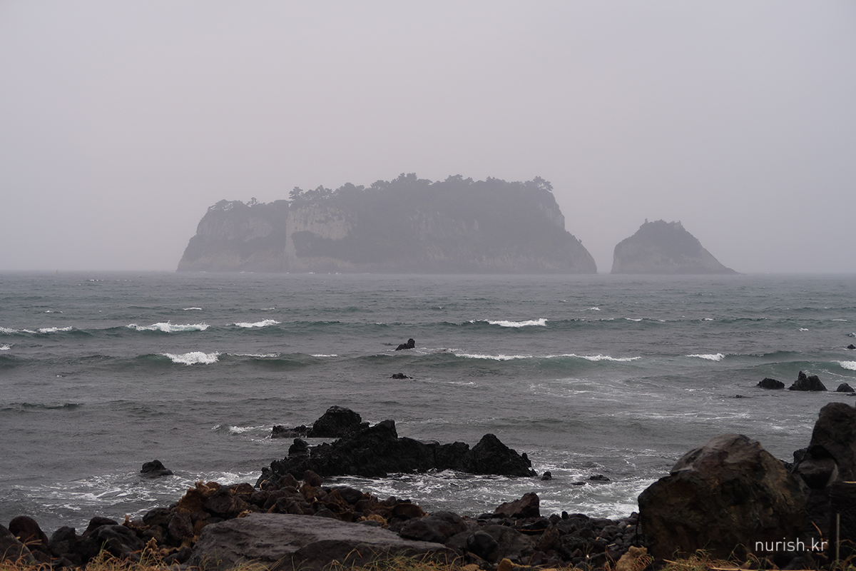 아침 맛있게 먹고 나왔더니 비 쏟아지기 시작 ㅜㅜ 그래도 다행인 건 차를 호텔 지하주차장이 아니고 옆쪽 공영주차장에 댔는데, 그때 비가 안 온 거다. 아주 번거로워질 뻔했다. 잠시 해안가에 차 대놓고 범섬 구경 중