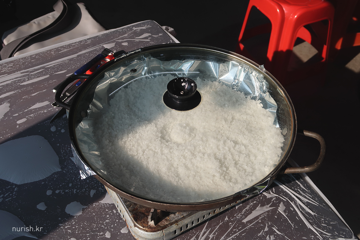 자리에는 이렇게 굵은소금이 잔뜩 넣은 프라이팬이 세팅되어 있다.