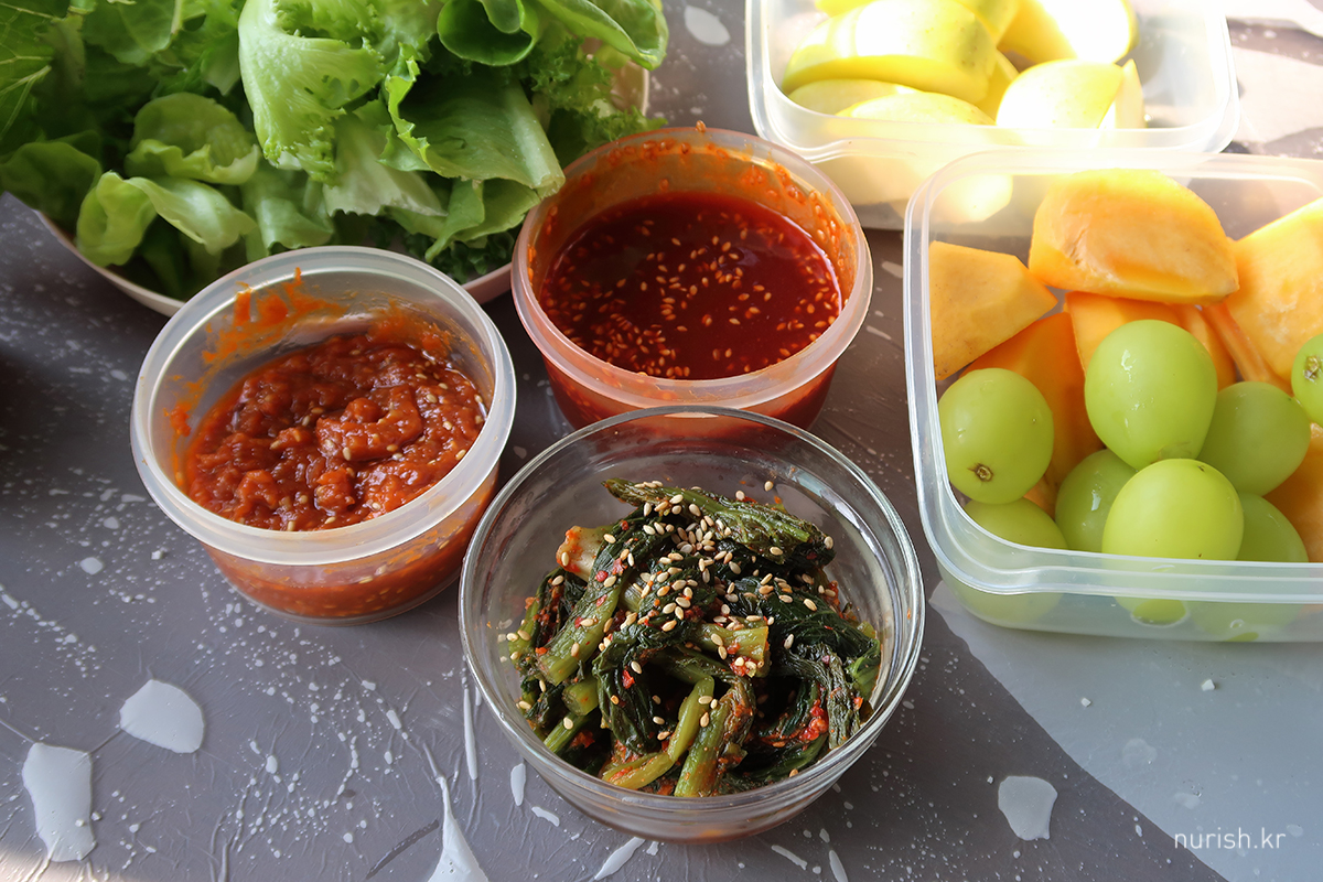 집에서 가지고 온 밑반찬과 양념 준비.