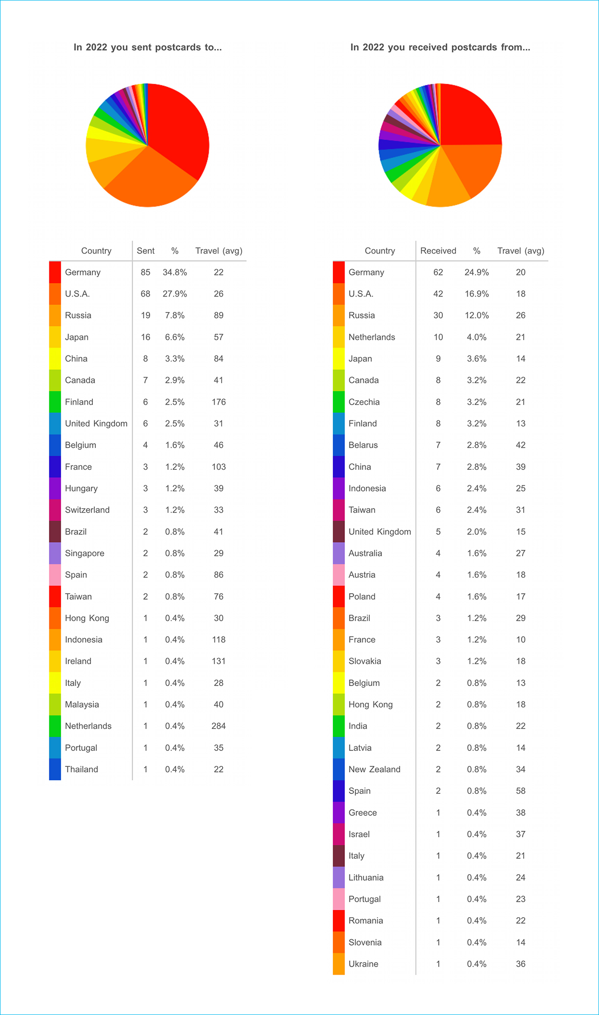 주고 받은 엽서가 가장 많은 나라는 역시 독일, 압도적 1위. 그리고 2위 미국, 3위 러시아. 2023년에는 좀 더 다양한 나라들과 엽서가 오갈 수 있으면 좋겠다.