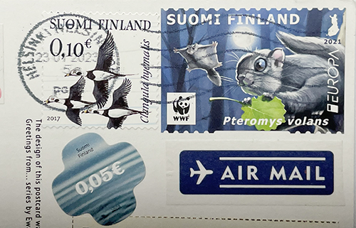 2021년 4월 28일 발행된 핀란드 유로파 우표, '하늘다람쥐(Pteromys volans)'. 2021년 주제는 '멸종위기종'.
