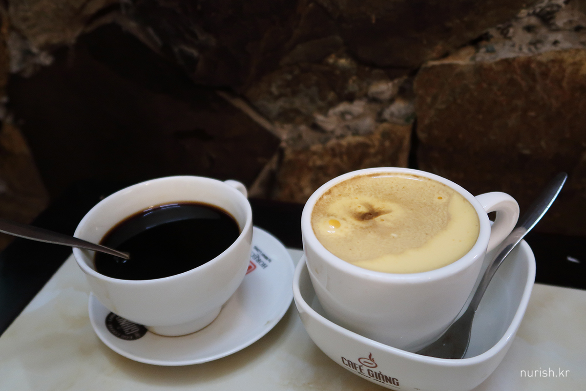 에그커피 원조라는 카페 지앙에서 따뜻한 블랙커피 한 잔과 따뜻한 에그커피 한 잔