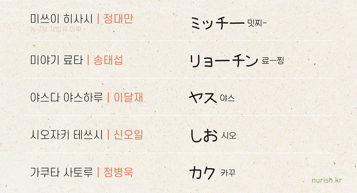 평화로운 북산 농구부 ㅡ경쟁 확률 제로인 부원들이라든가 완전히 자기편으로 인식한 정대만과 송태섭ㅡ는 이름에서 파생한 애칭으로 부른다.