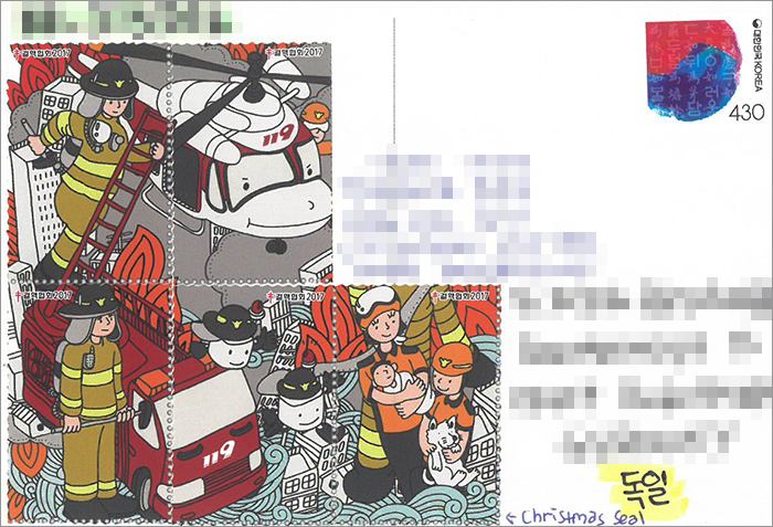 소방관 은퇴하신 포스트크로서라 엽서 리퀘가 소방서 관련인데~ 소방관 관련 엽서는 없고 서랍 뒤지다 보니 2017년 크리스마스 씰이 소방관이어서 이렇게 잔뜩 붙였다. ㅋㅋ