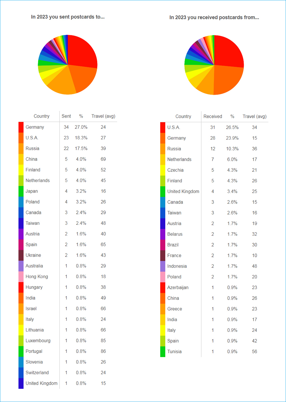 내가 엽서를 보낸 25개 나라 중, 제일 많이 보낸 나라는 독일, 22개 나라 중, 내가 엽서를 제일 많이 받은 나라는 미국 :)