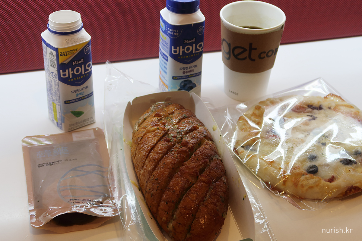어제 저녁에 함덕 도착하자마자 찾은 오드랑베이커리에서 사 온 빵들과 호텔 1층에 있는 GS25에서 사온 커피와 요거트