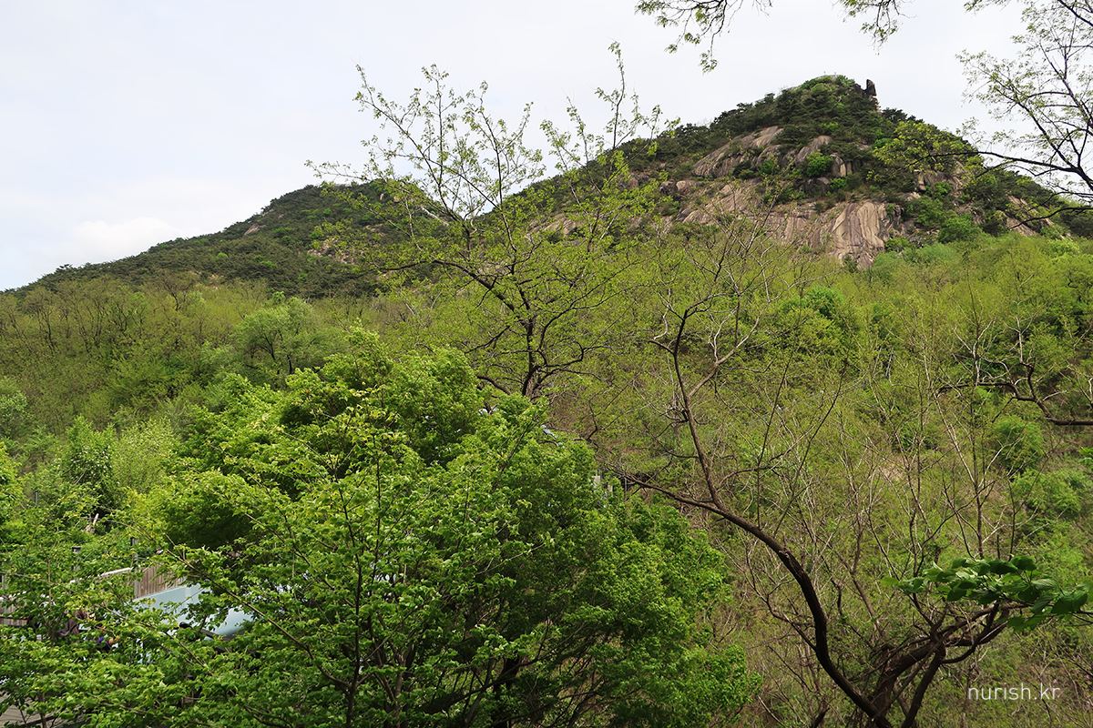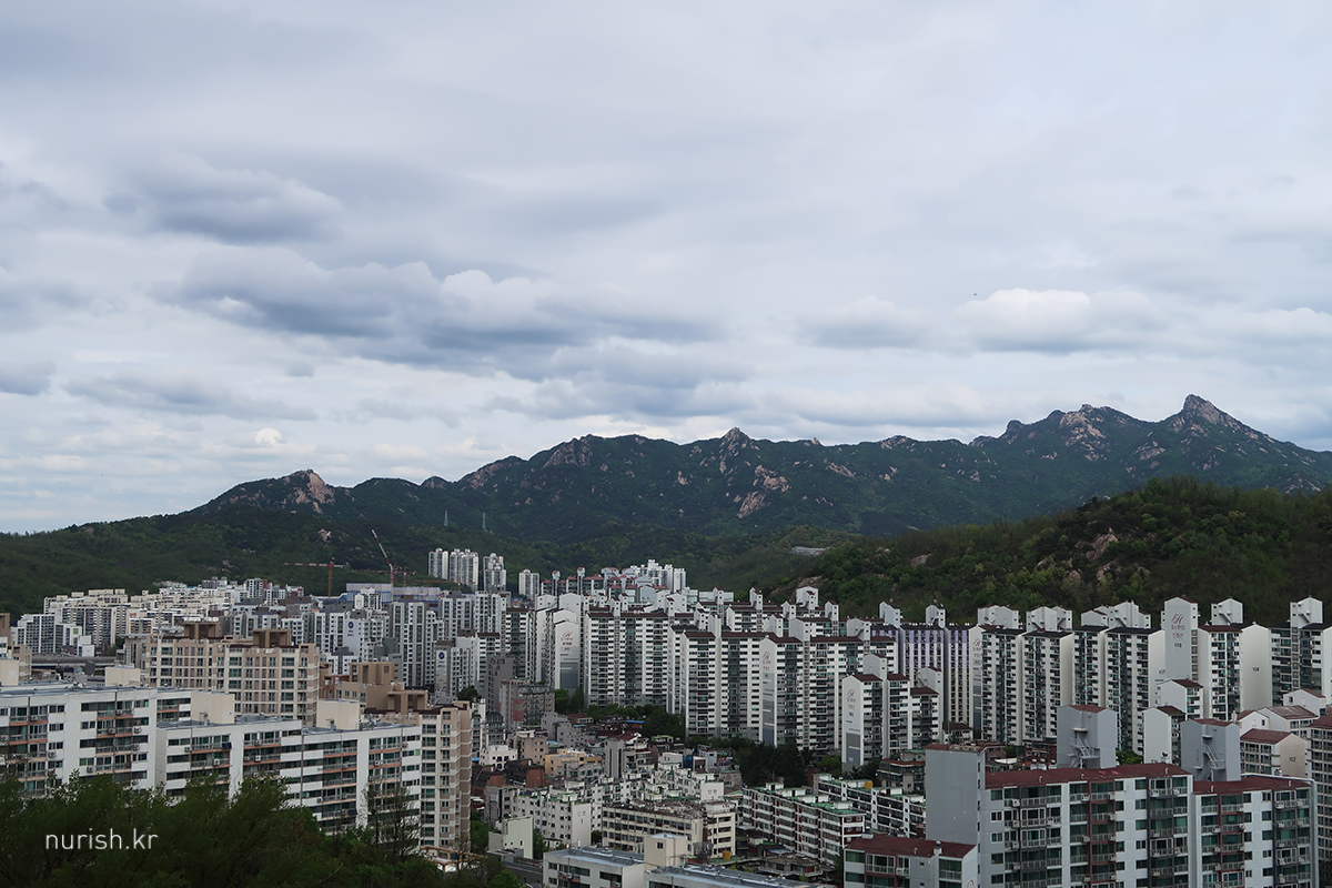 안산과 무악재하늘다리를 사이에 두고 높이 솟은 인왕산