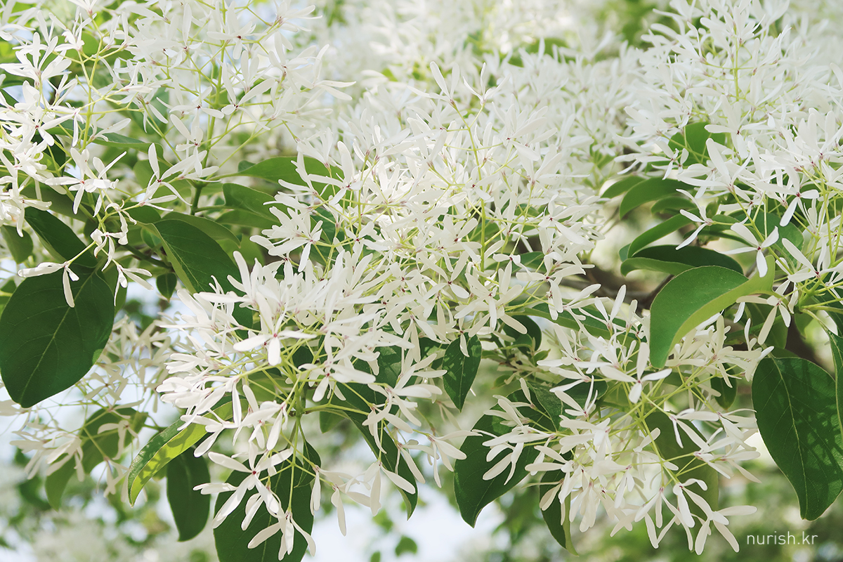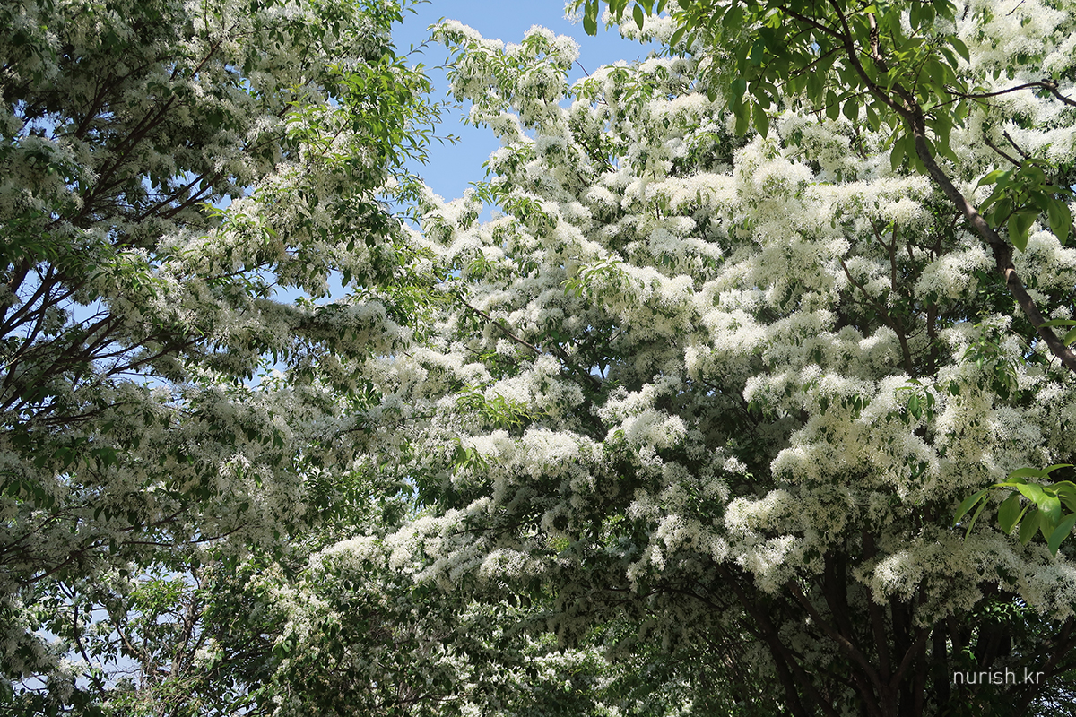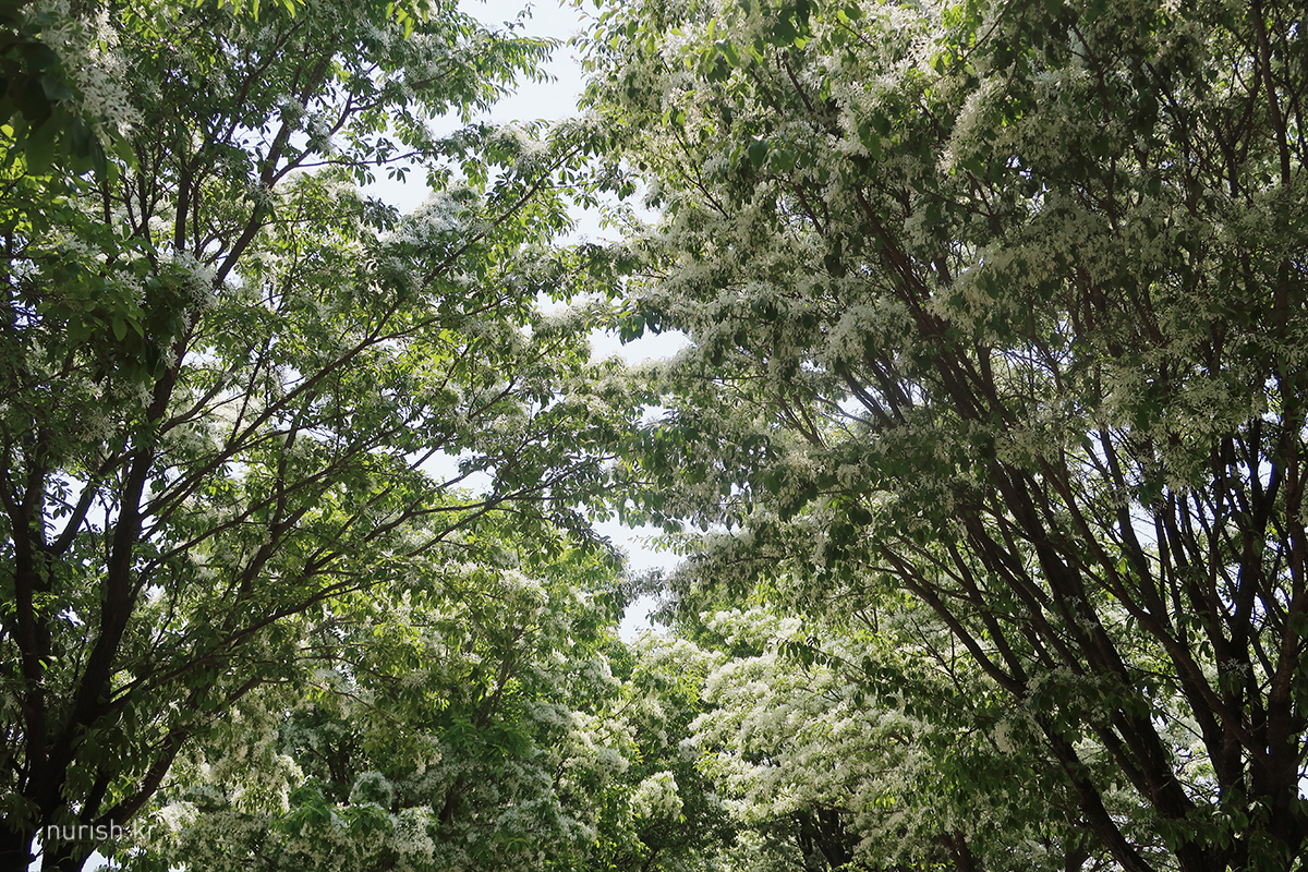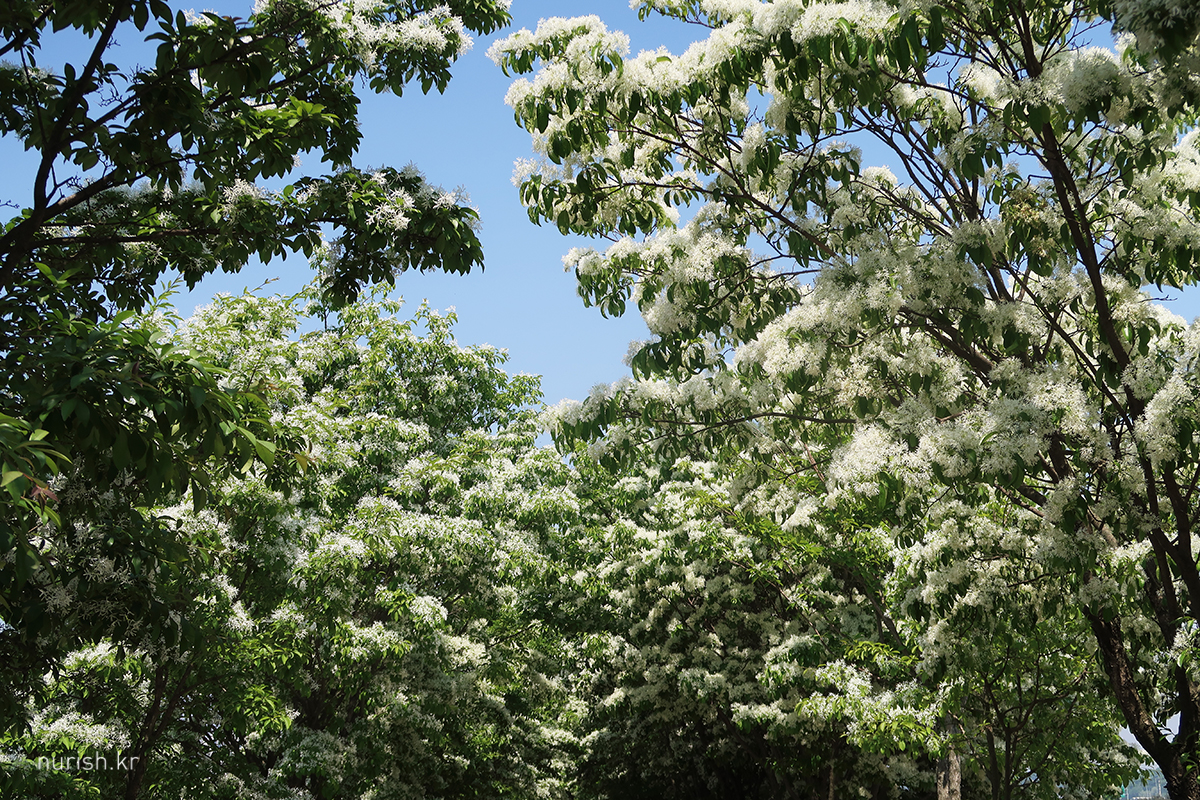 꽃송이가 사발에 소복이 얹힌 흰 쌀밥 같아서 '이밥나무'라고 부르던 게 '이팝나무'가 되었다는 설도 있고, '입하(入夏)' 무렵 꽃이 피기 때문에 '입하목'이라고 부르던 게 '이팝나무'가 되었다는 설이 있다는데, 내 눈에는 어떻게 봐도 샐러드에 뿌려 놓은 간 치즈들 ㅎㅎ 이러나 저러나 참 귀엽다.