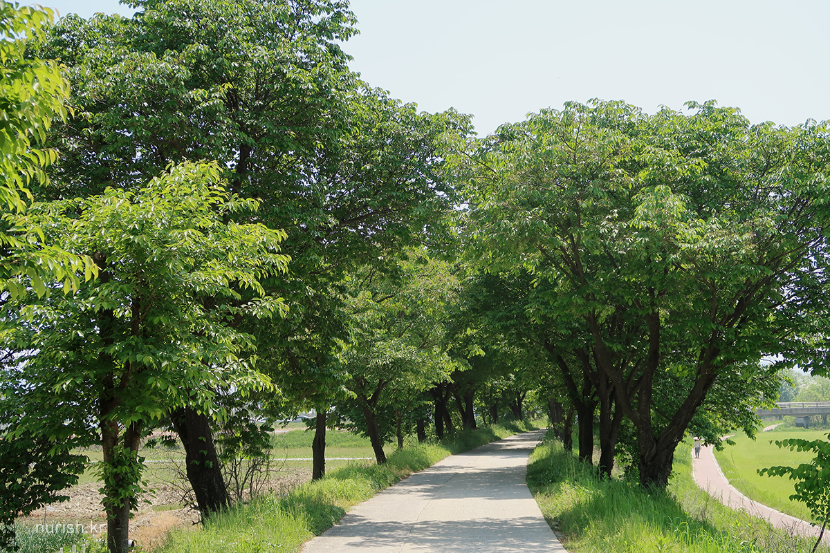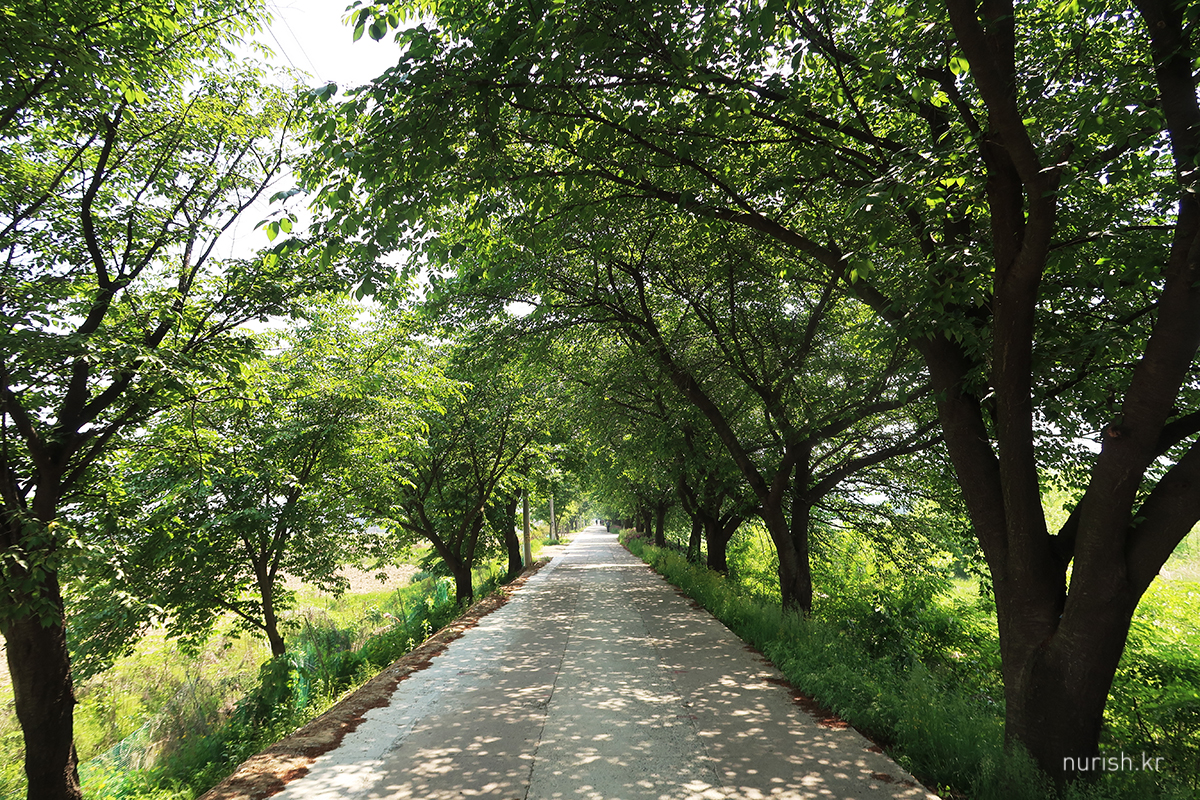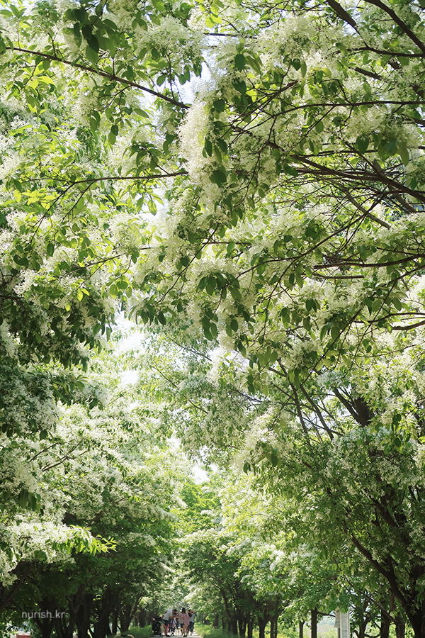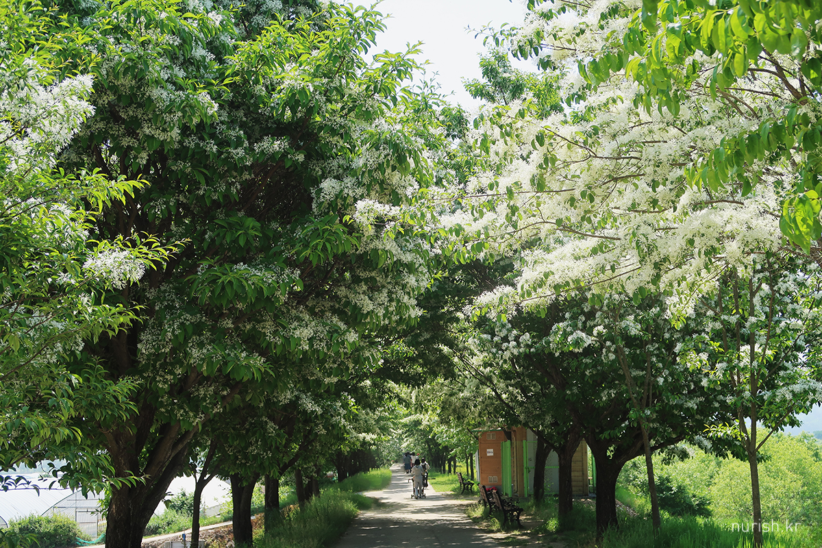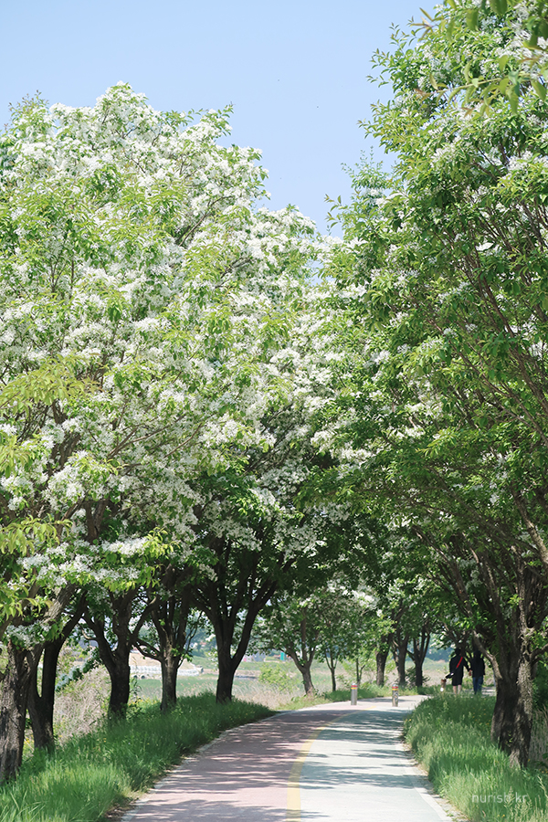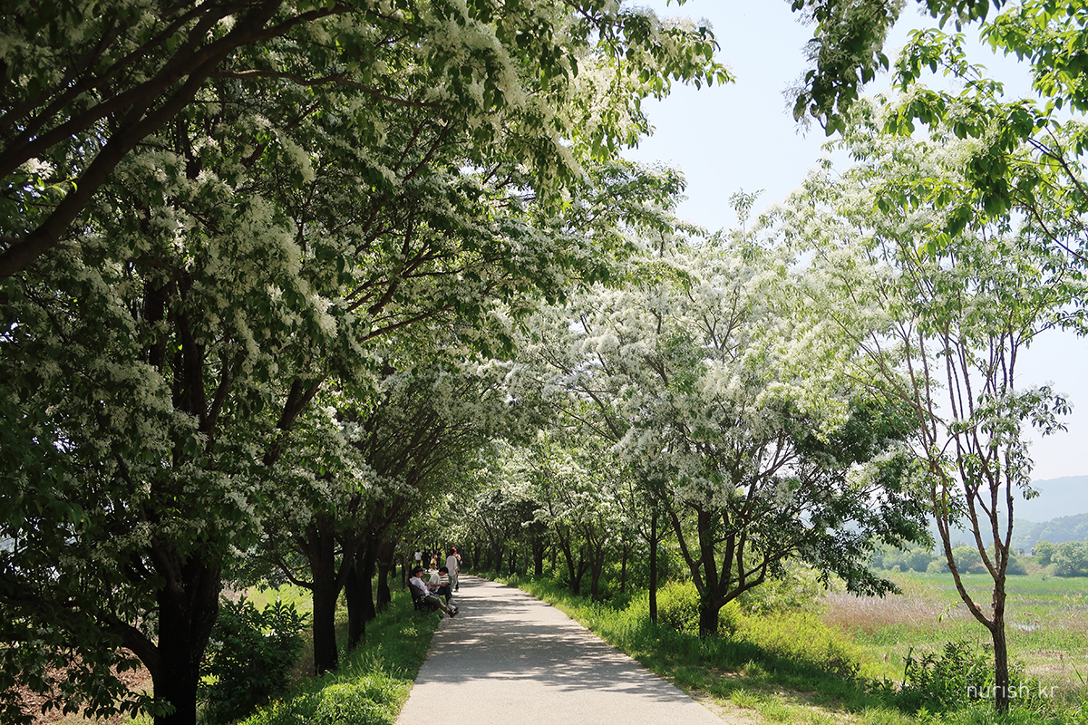 시장 근처에 있는 진천2교에서 신정교 쪽으로 쭉 걸어가다 보면 눈에 보이는 하얀 꽃길. 진천군이 지역 쌀을 알리고자 20년 전부터 심은 게 이렇게 멋진 꽃 터널을 이뤘다고 한다.