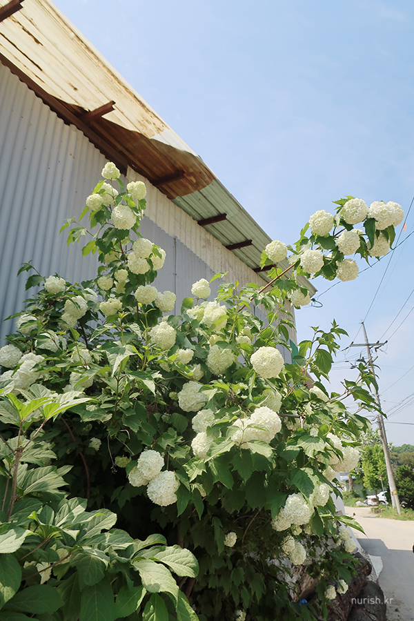 식당 옆 공터에 주차하고 나서 시골 내음 가득한 주위를 둘러보는데 눈에 띈 불두화. 꽃의 생김새가 부처의 머리처럼 곱슬곱슬하고 부처가 태어난 4월 초파일 앞뒤로 꽃이 만발하는지라 이름이 불두화란다. 그런데 입하(올해 5월 5일) 무렵 꽃이 피기 시작했다는 이팝나무도 그렇고, 4월 초파일(올해 5월 15일) 앞뒤로 꽃이 핀다는 불두화도 그렇고 기후온난화 탓인가, 이름 유래에 비해 다들 꽃이 이르게 폈다. ㅜㅜ