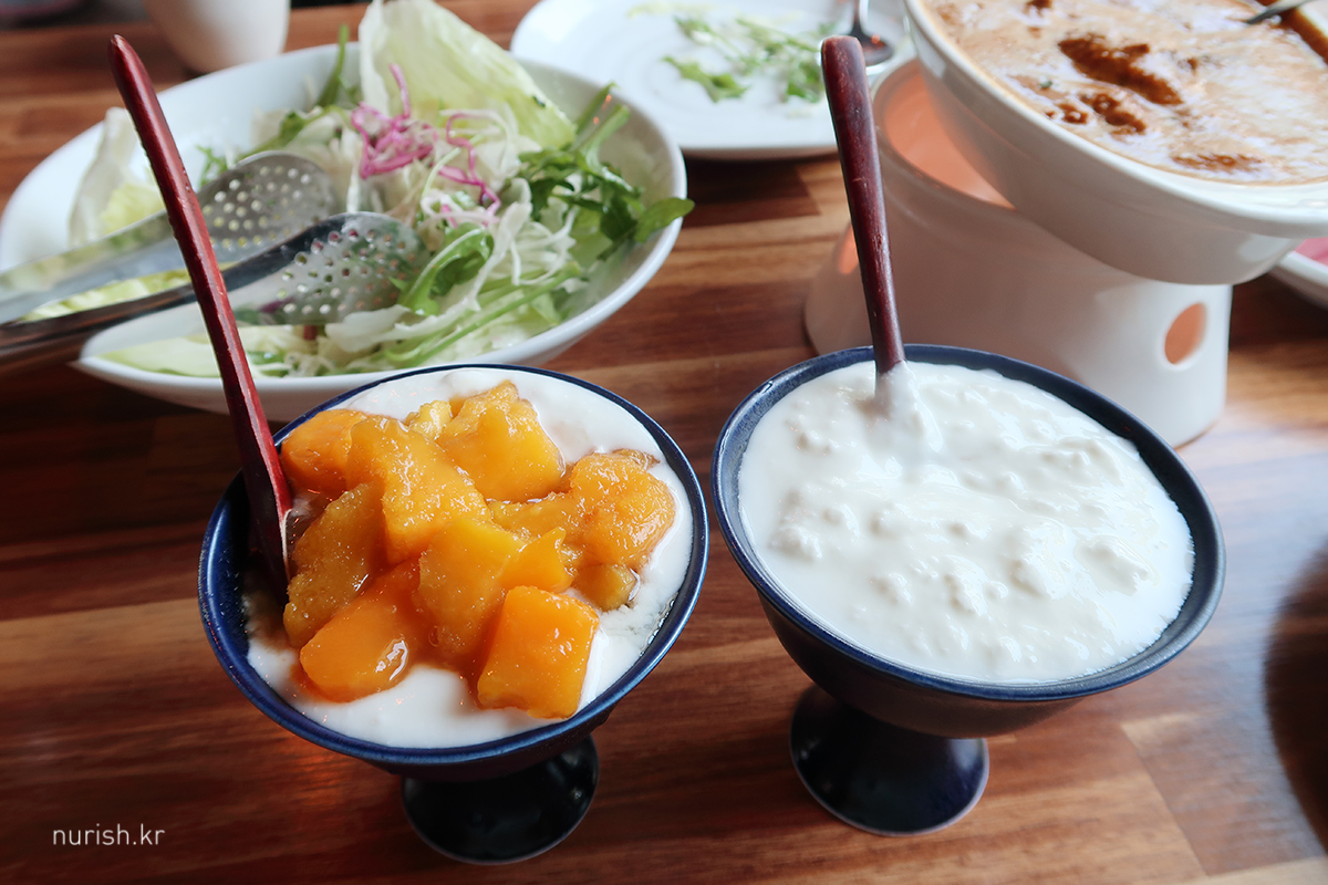 망고 라씨와 사장님이 적극 추천해 주신 루바브 라씨, 직접 재배하신 루바브를 넣은 거라고 하셨는데, 과육이 새콤달콤 맛있어서 당연히 열매인 줄 알고 생과일을 먹어 보고 싶다고 생각했는데, 집에 와서 어디서 살 수 있나 검색해 보니 뿌리 채소였다는 반전(?)이 있었다. 외국식자재 마트에 가면 구할 수 있다 하니 한번 찾아 봐야겠다. 루바브 잼을 만들어서 요거트에 섞은 다음, 내 사랑 카스 테이블워터 크래커 위에 올려 먹으면 여기서 사장님이 추천해 주신 대로 난 위에 루바브 라씨 올려먹던 맛을 흉내 낼 수 있을 듯하다.