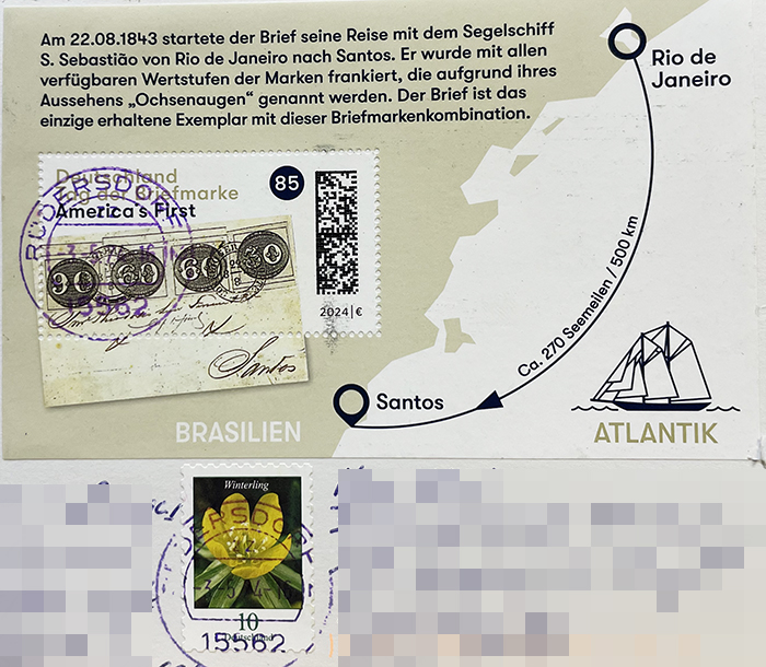 우표 이야기를 잠깐 하자면, 브라질은 1843년 8월 1일, 전 세계에서 세 번째, 아메리카 대륙에서는 첫 번째로 우표를 발행한 나라라고 한다. 왕방울눈(ox-eyes)이라는 별칭을 가진 30, 60, 90레이스(브라질의 옛 화폐 단위)짜리 우표였다. 1843년 8월 22일, 한 발송자가 당시 수도였던 리우데자네이루에서 90레이스짜리 우표 한 장, 60레이스짜리 우표 두 장, 30레이스짜리 우표 한 장을 붙여서 편지를 부쳤다. 편지는 선편을 통해 남쪽으로 500km 떨어져 있는 항구 도시 산투스로 전달되었다고 한다. 지금까지 남아 있는 자료 중, 우표를 붙여서 부친 아메리카 대륙의 '첫 번째 편지'라는 듯하다.