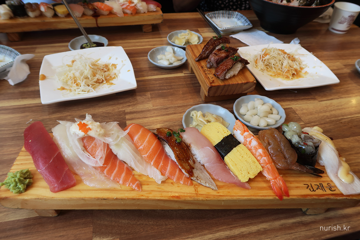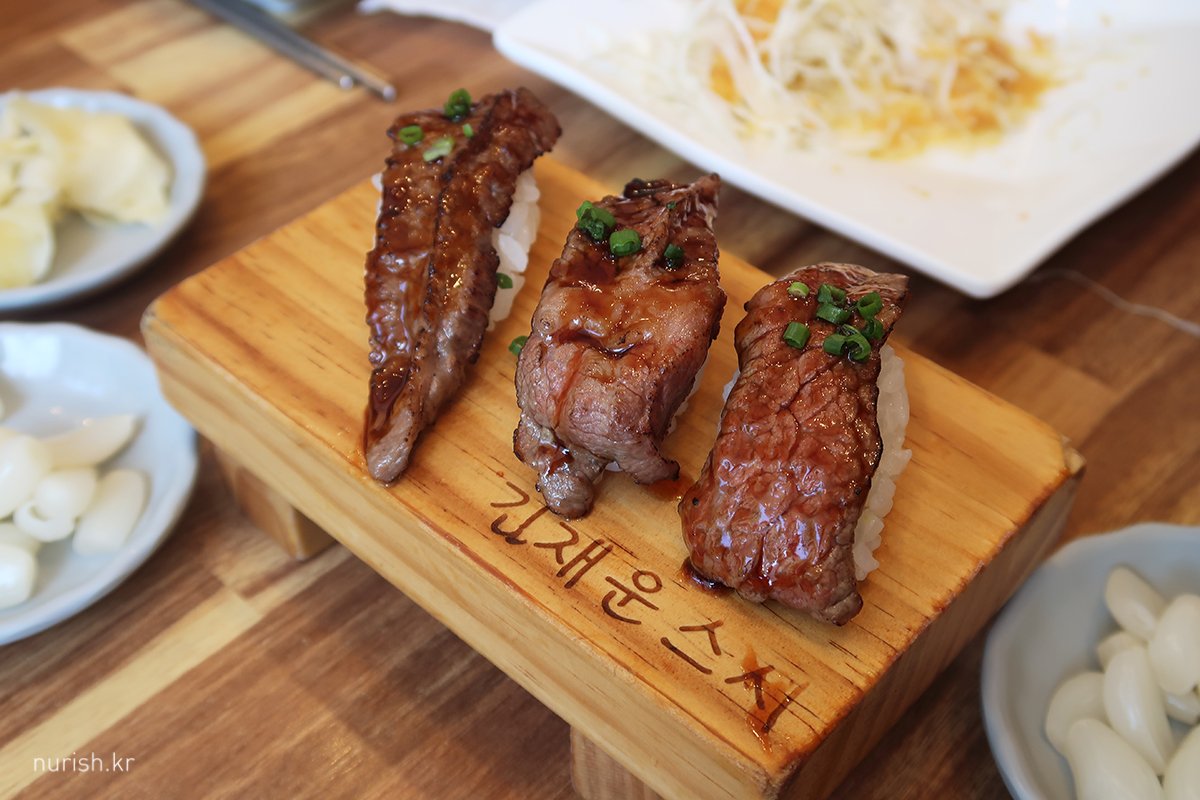모처럼 초밥집에 왔는데, 초밥을 한 조각도 안 먹는 건 좀 아쉬워서 꽃등심초밥을 시켜 보았다. (흡족ㅋㅋ)