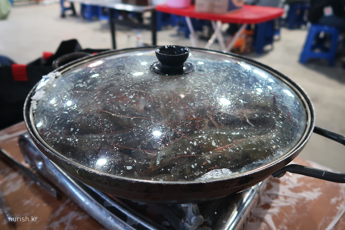 신속하고 효율적인 진행을 위하여 한 사람이 새우를 살 동안 나머지 사람은 버너와 프라이팬 등 자리 세팅을 하고 있어야 좋다.