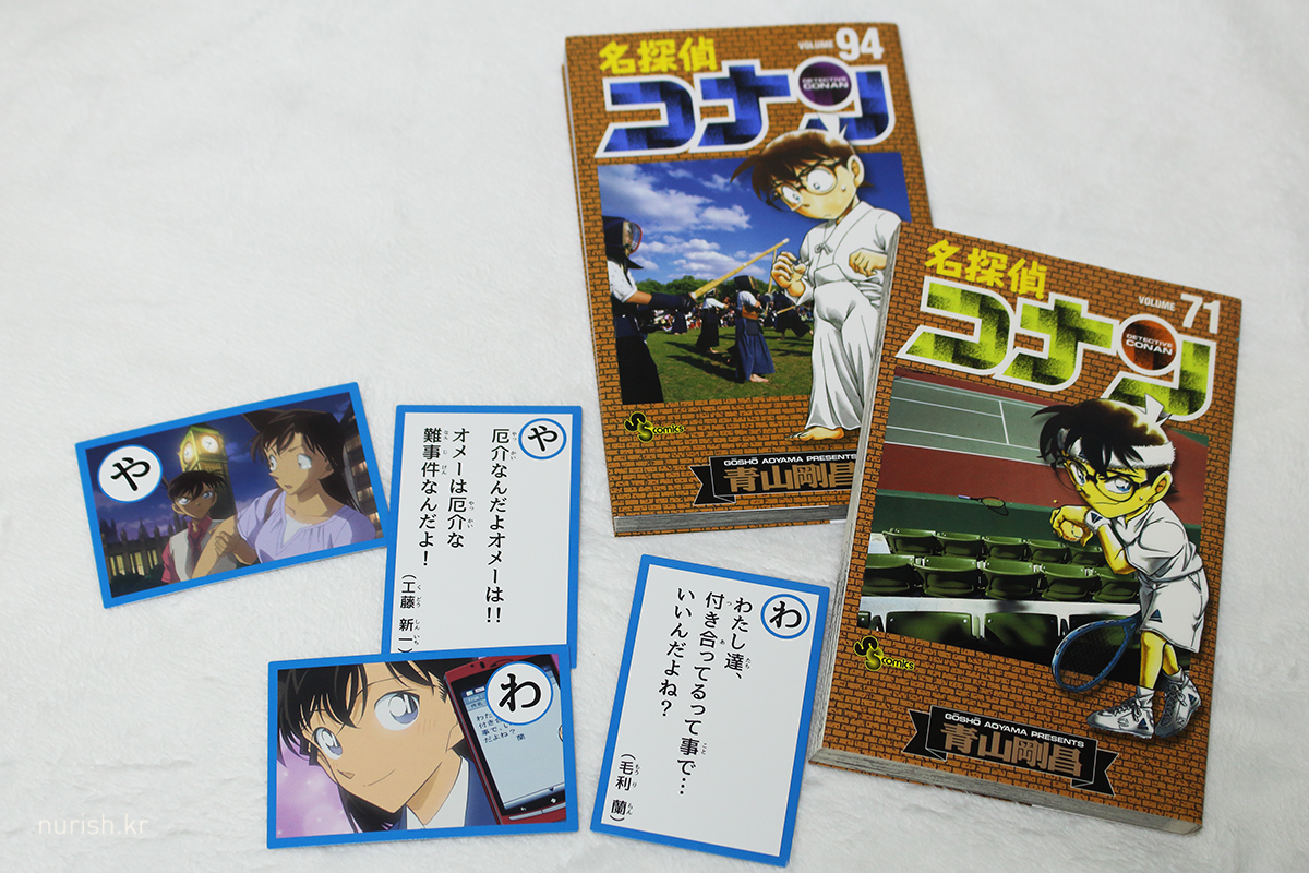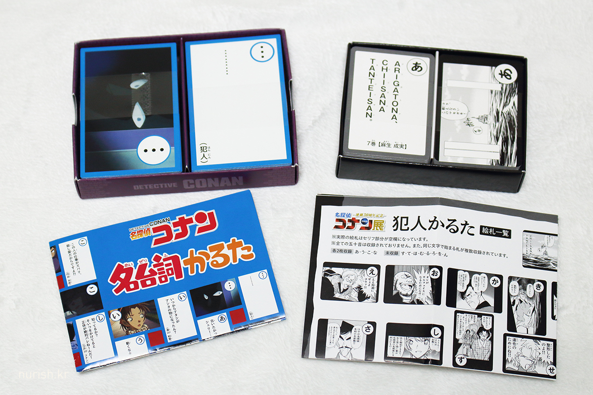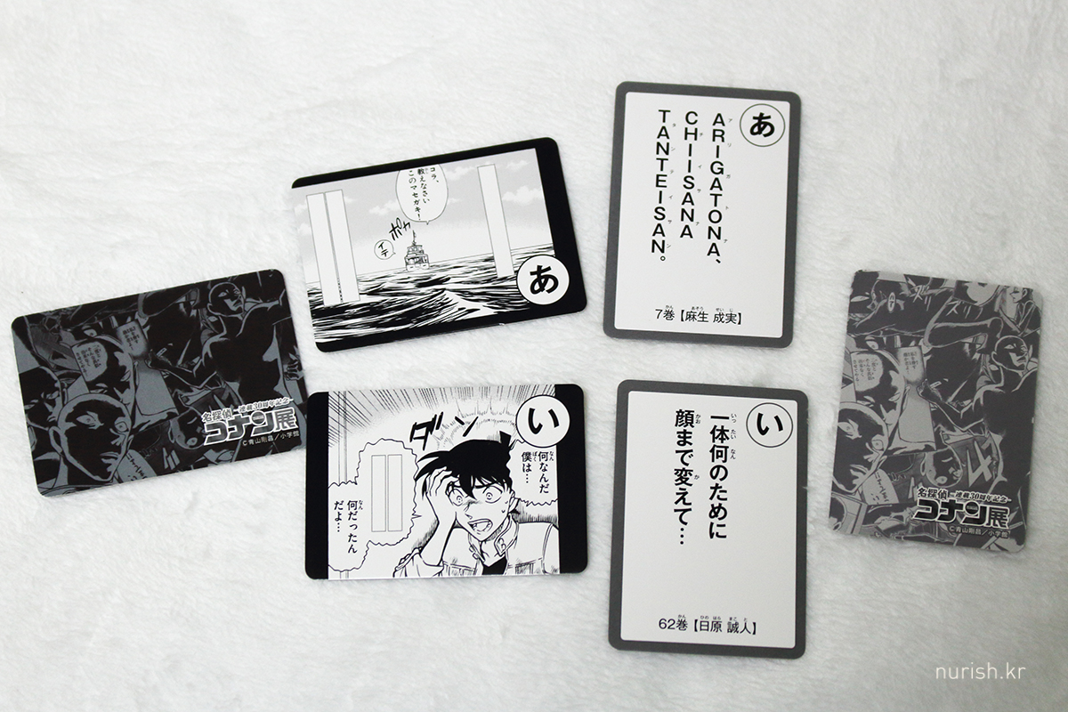 명대사 가루타는 컬러이고, 범인 가루타는 흑백이다. 범인 가루타는 크기도 작은데 한정판이라고 가격은 더 비쌈 ㅜㅜ