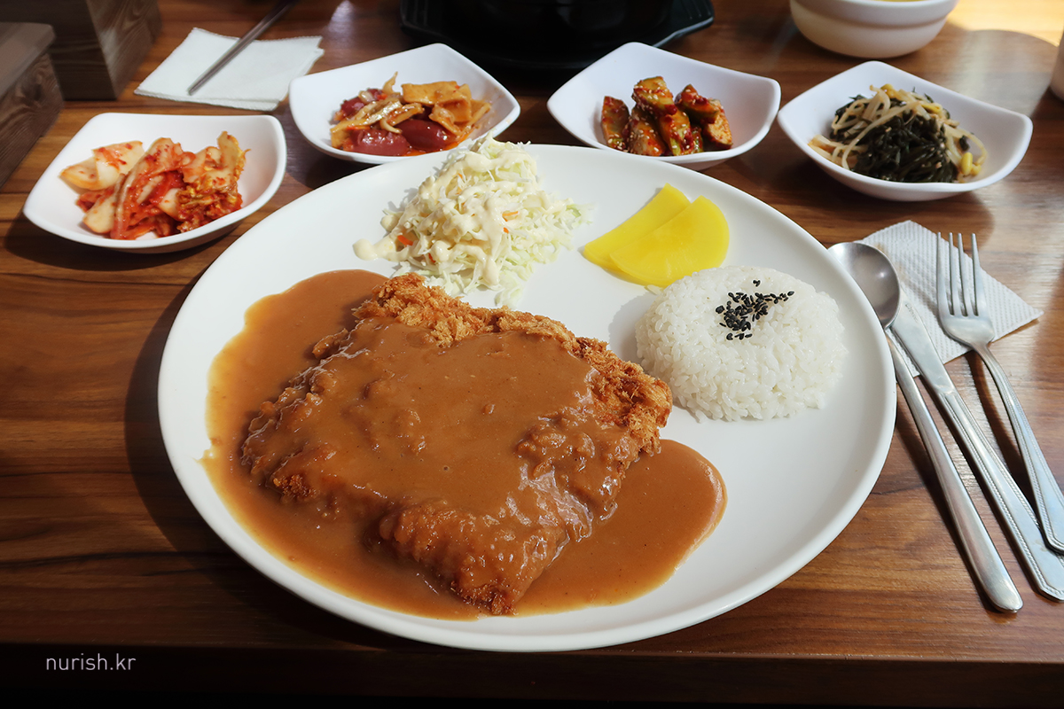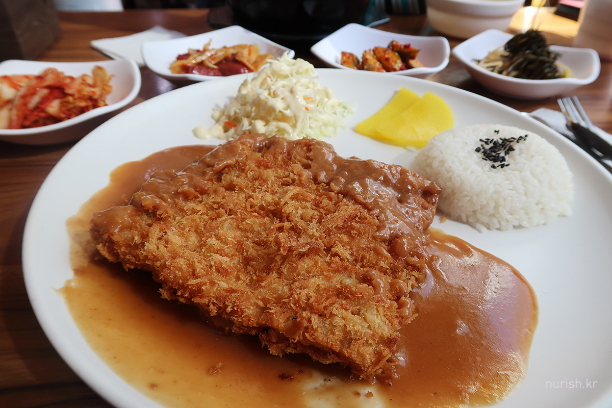 요즘 유행하는 돈가스 먹기 팁대로 먹어보려고 뒤집어 봄 ㅋㅋ 한쪽면은 촉촉 한쪽면은 바삭!
