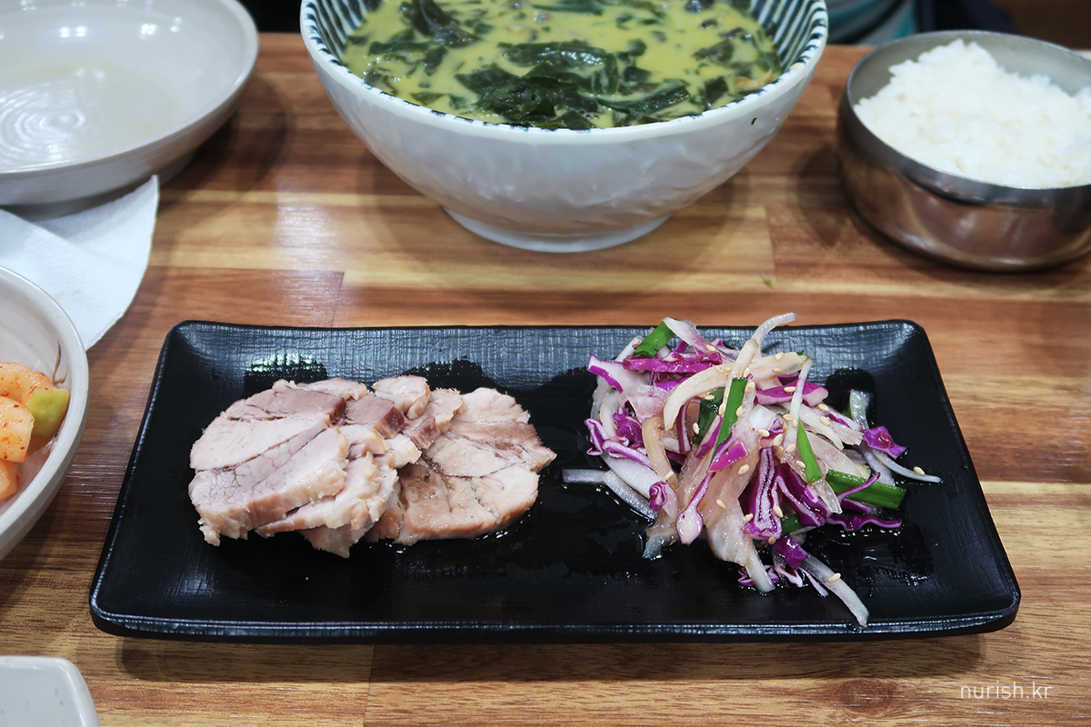 보말국의 곁들임 반찬인 흑돼지 훈제 수육