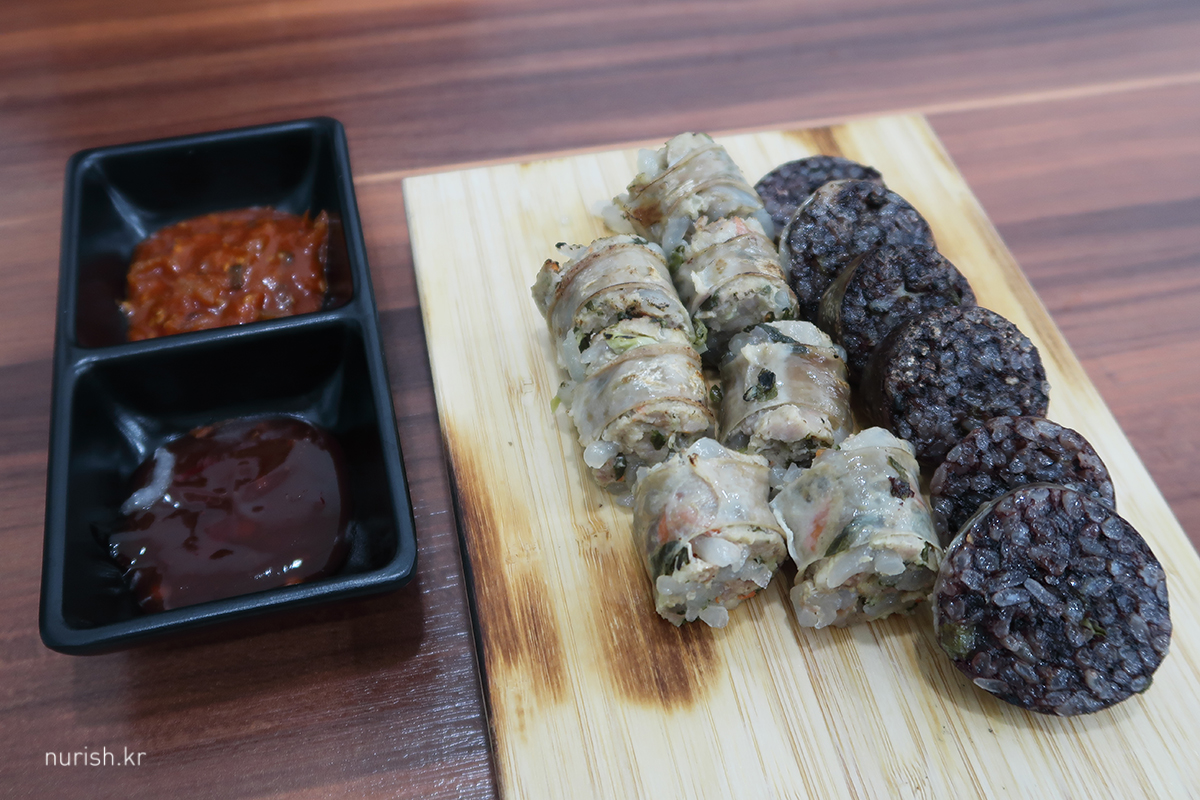 맛보기 순대를 시키면 찹쌀순대와 부추고기순대와 막창순대라는데, 우리가 마감 직전에 오는 바람에 막창순대는 소진되었고 ㅜㅜ 부추고기순대로 채워 주셨다. 오랜만에 먹는 제주식 찹쌀순대는 꽤 만족스러웠다.