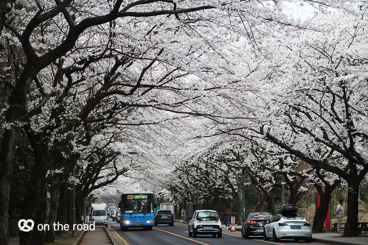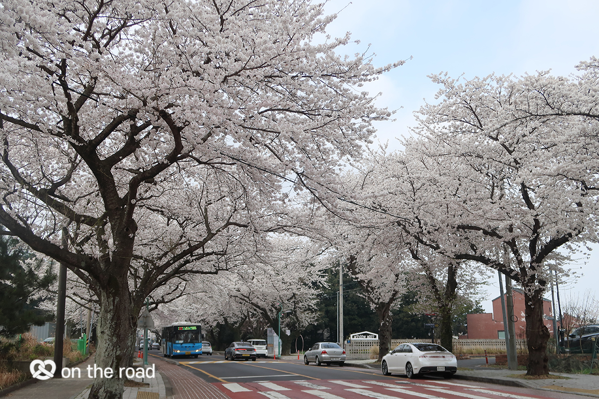 제주도 버스가 파란색이어서, 벚꽃 터널이랑 같이 찍으면 예쁠 듯하여 버스 지날 때마다 도전해 봤다.