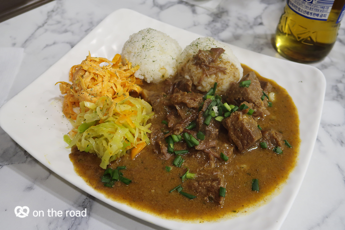우리가 주문한 음식은 소고기가 잔뜩 들어 있는 굴라쉬와