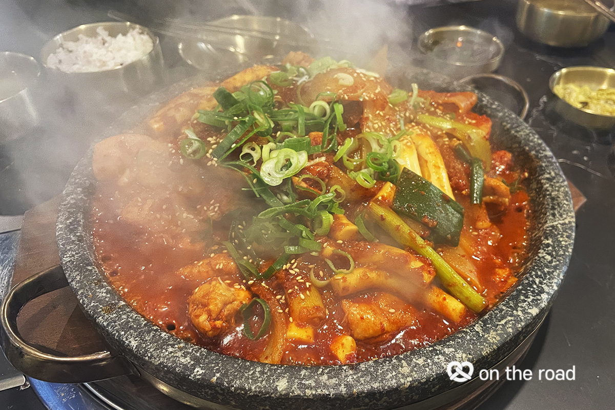 비 오는 날, 잘 어울리는 점심 메뉴. 회사 근처에 괜찮은 닭볶음탕 집이 생겼다는 소문을 듣고 찾았는데 맵찔이에게는 기본 맛도 좀 많이 맵게 느껴졌지만, 맛있게 잘 먹었다. 맵도리찜이랑 맵지 않은 부추버섯전과의 궁합이 아주 좋았다. 부추버섯전은 매우 건강해지는 맛!