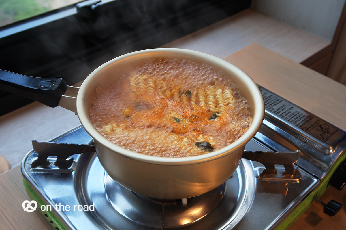 진천에서 묵은 호텔에는 라면을 끓여 먹을 수 있는 공간이 마련되어 있었다. 각종 라면과 밥, 라면에 넣어 먹을 수 있는 어묵, 떡 등 재료를 제공해 준다. 재미있어서 우리도 참깨라면 도전.