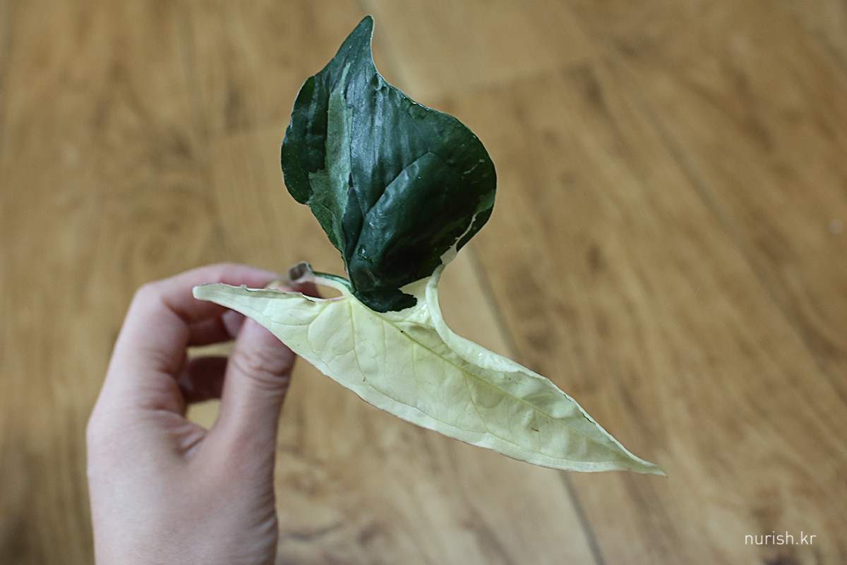 2021년 8월 9일, 물꽂이해서 갓 순화 끝난 싱고니움 삽수 들인지 약 168일. 생각보다 훨씬 잘 자라 주었지만 위쪽 무늬도 마음에 안 들고, 촉 여러 개로 풍성하게 키우고 싶어서 가위를 들기로 했다.