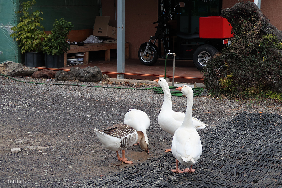 맛있게 먹고 나왔더니 식당 맞은편 집에 거위(?) 가족들이 마실을 나왔다.