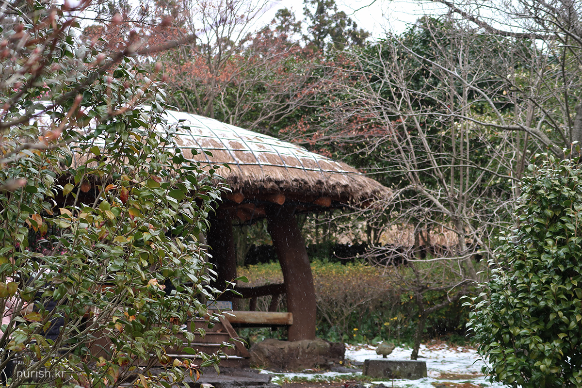 어제처럼 눈보라가 몰아치진 않아서 카멜리아힐에 왔다. 눈은 여전히 내리는 중.