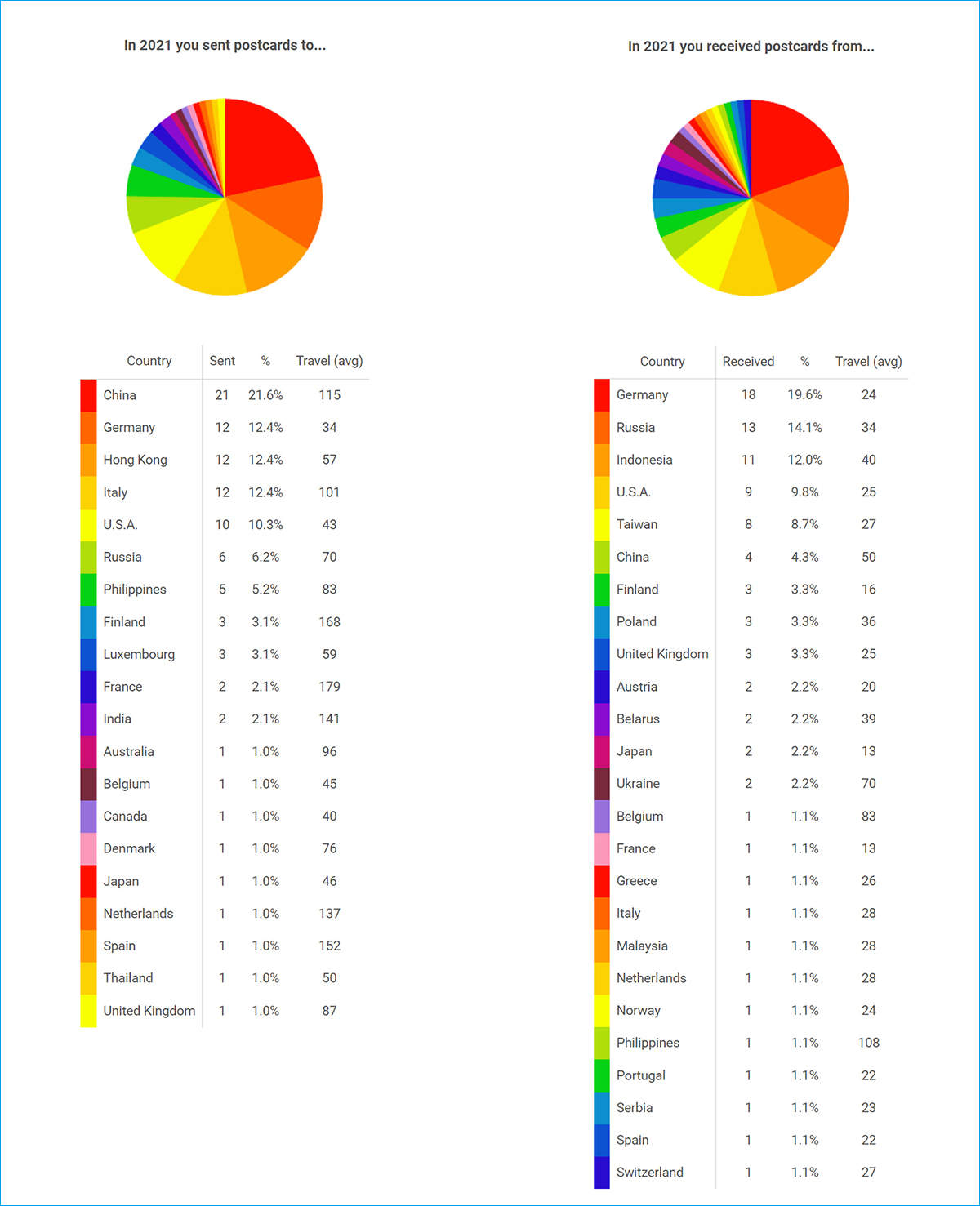 보낸 엽서 중에 도착하기까지 가장 오래 걸린 건 중국으로 보낸 엽서, 350일. 20년 12월에 보냈는데 21년 11월에 도착했다. 어딜 그렇게 헤맨 건지ㅠㅠ 그저 잘 도착해 줘서 고마울 따름ㅠㅠ