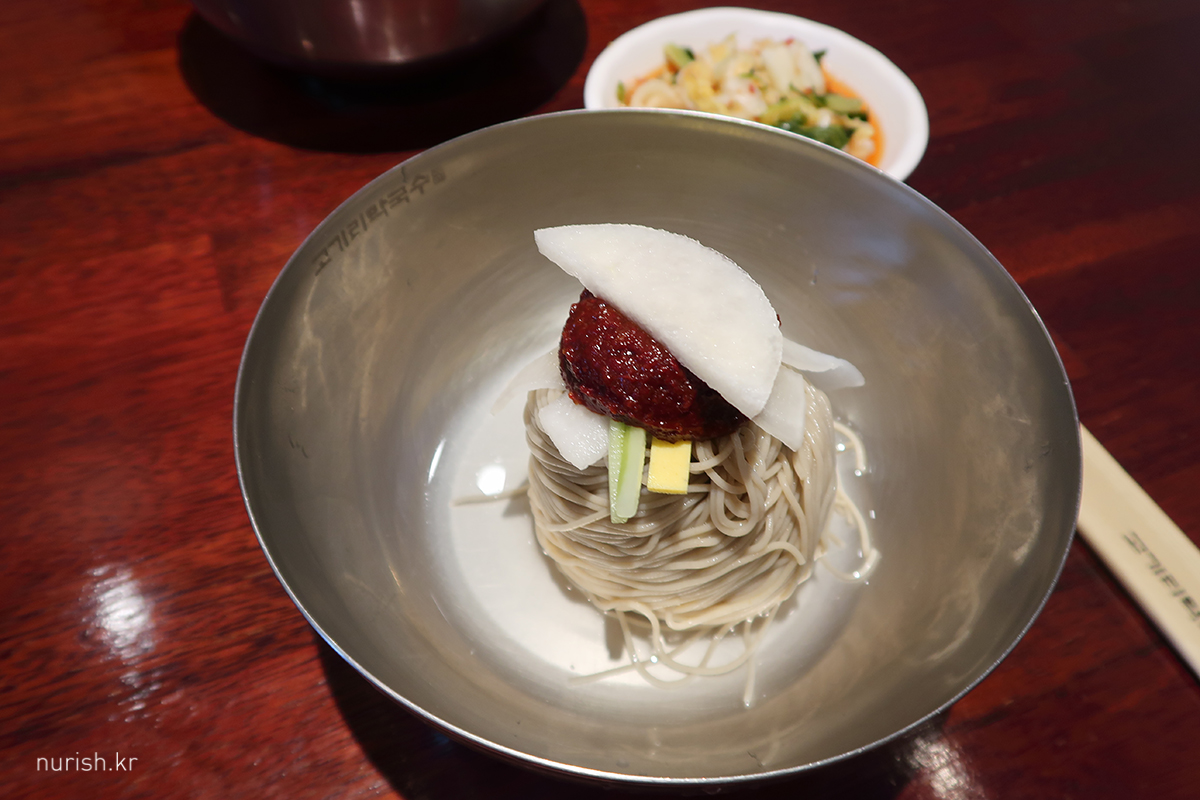 점심 겸 저녁 메뉴는 고기리막국수의 들기름막국수랑 비빔막국수랑 수육!