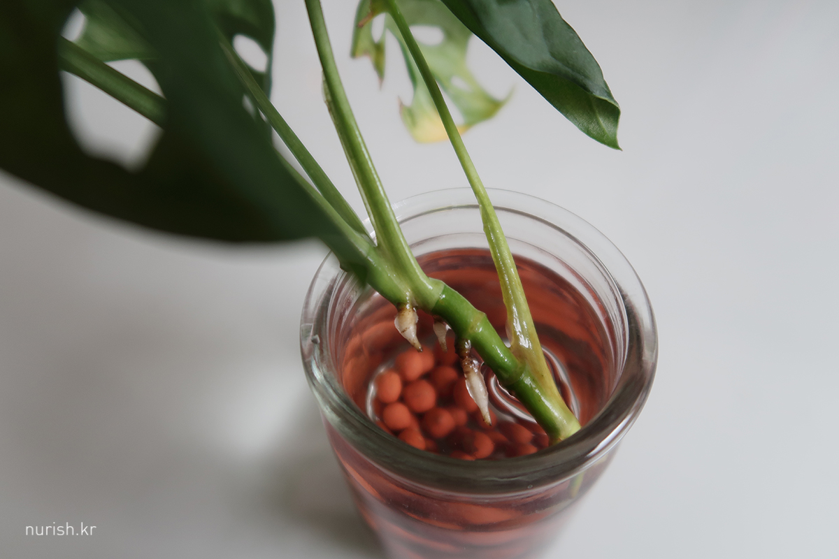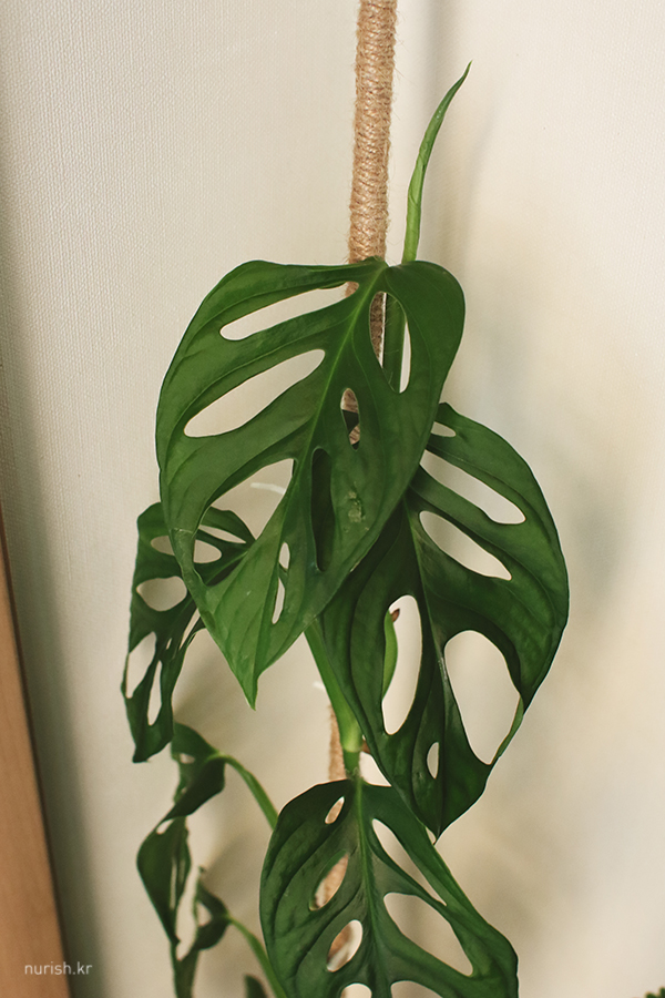 예쁜 새잎 나는 중. 몬스테라답게 뿌리가 잘 발달하는데 기존 화분(10cm) 물구멍마다 다 탈출해서 길어졌길래 ㅋㅋ 15cm 화분으로 옮겨 주었다. 지지대 세워줄까 하다가 귀찮아서... 일단은 그냥 키우기로 했다.