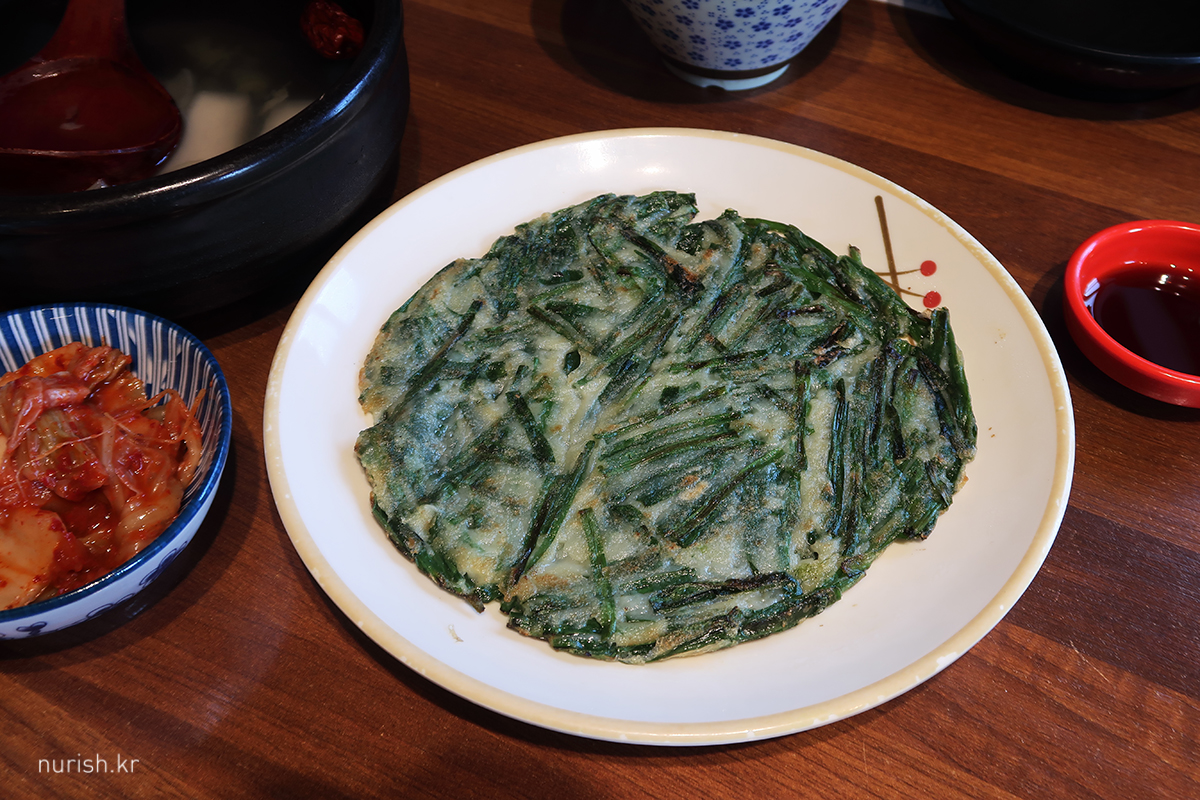 주남저수지돌짜장 식당에서는 이렇게 부추 부침개를 직접 부쳐 먹을 수 있다.