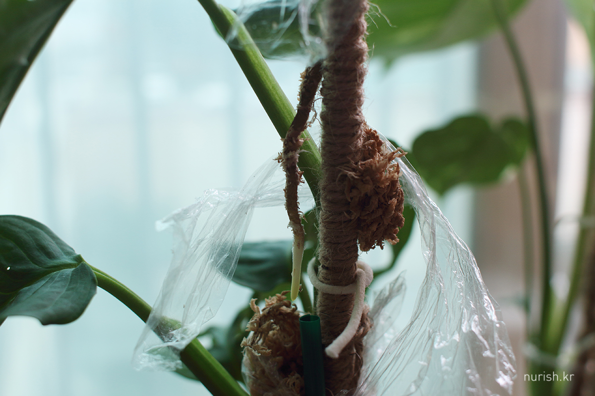 초록창 식물 카페에 아단소니 이파리가 자꾸 작아진다는 고민글을 올렸더니 공기뿌리에 수태랩핑해 주면 잘 자란다고 조언이 있어서, 며칠 전 나도 시도해 보았다. 손끝이 무뎌서 썩 깔끔하지는 않다. ㅋㅋㅋ