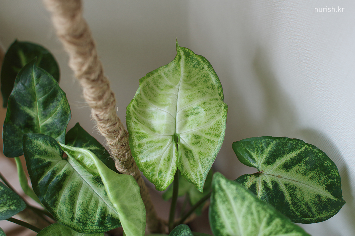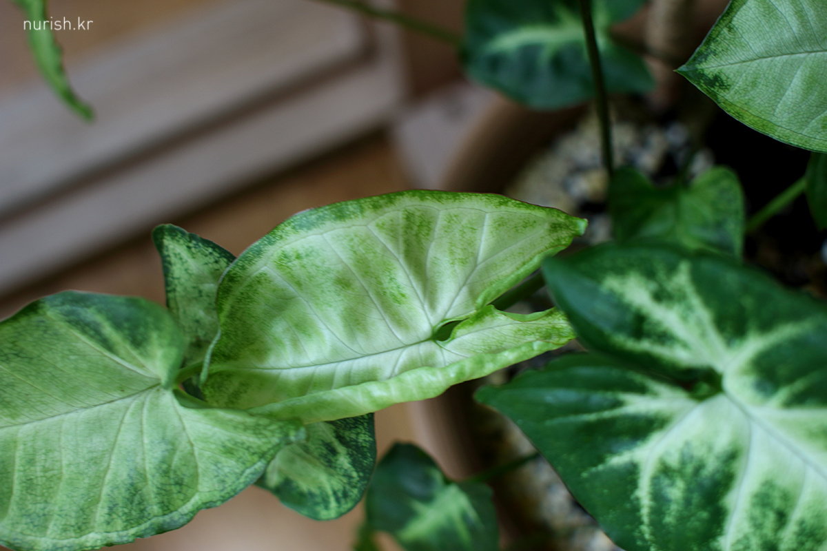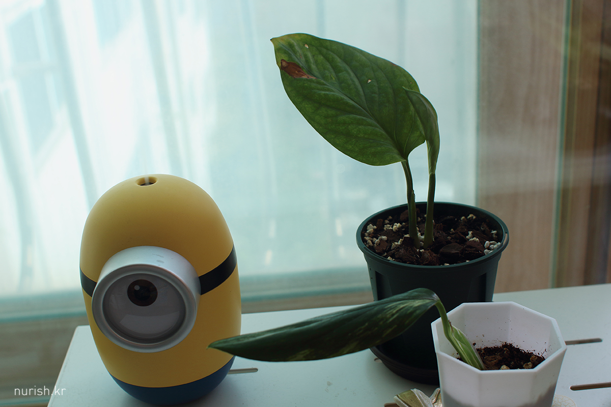통풍 잘 되는 곳에 두고 햇빛 좀 쐬주었더니 잎이 뒤로 휘었다. 검색해 보니 건조해서 그렇다는 글을 읽고 공중 습도 높이는 중.