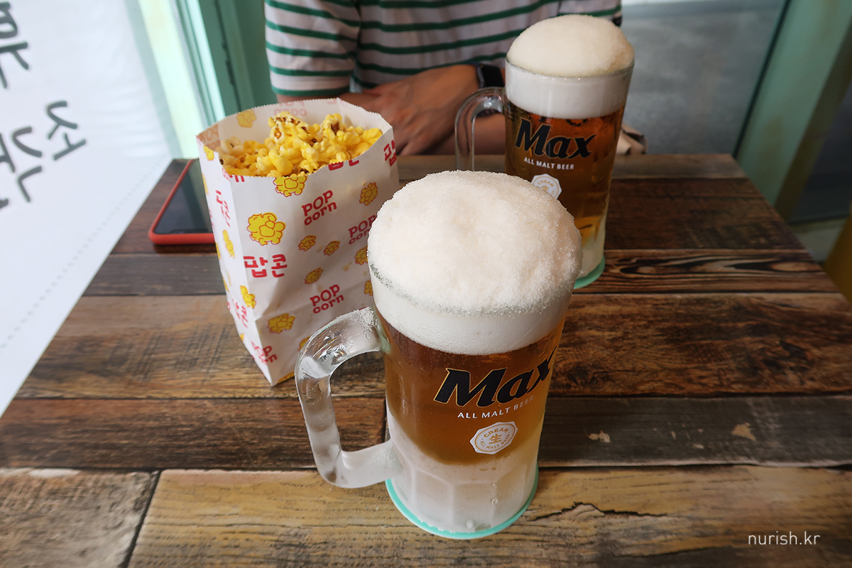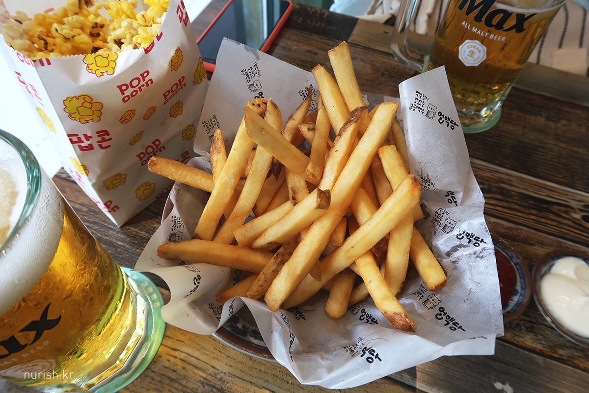 저녁은 '블랙위도우' 보기 전, 시원한 맥주 한 잔 곁들여 간단하게 요기하러 얼맥당에 왔다. 들어온지 얼마 안 되어서 비가 미친듯이 쏟아져서 완전 깜짝 놀랐네.