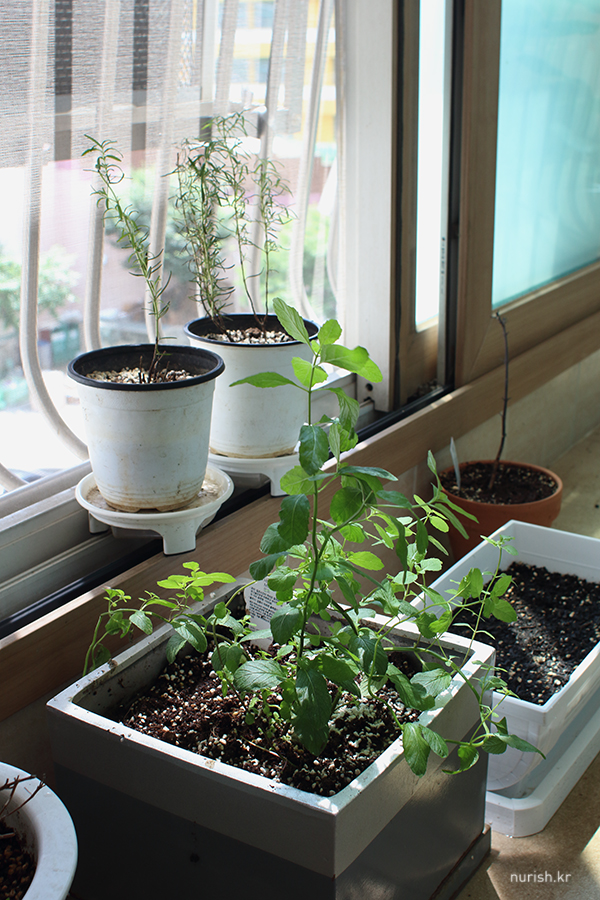 뿌리파리를 비롯한 각종 벌레들과 전쟁 중인 민트. 과산화수소 물도 먹고 비오킬도 먹은 뒤 바람 쐬며 휴식 중. 제발 다 죽어 주세요ㅠㅠㅠ 민트 뒤에 있는 로즈마리는 흰가루병에 걸려서 난황유를 먹고 요양 중.