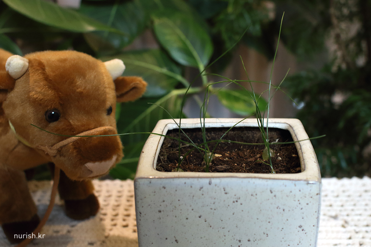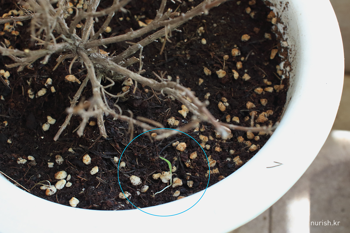 초록나라로 보내고 싶지 않아 어떻게든 살려 보겠다고 방치 중인 로즈마리 화분에 새로운 싹이 돋았다.