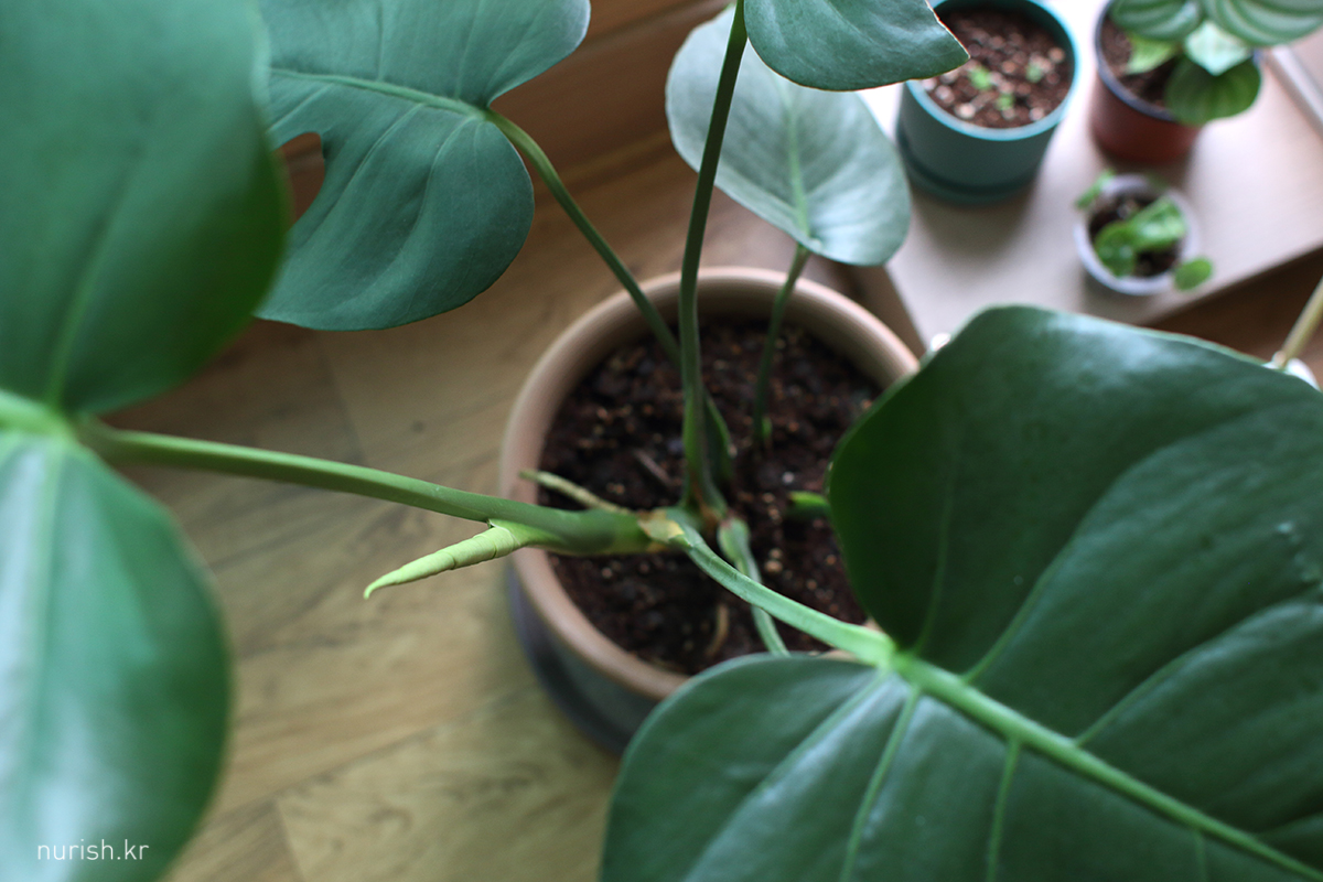 오늘은 몬데이니까, 몬스테라 한 장 더 ㅋㅋ 신엽 새순이 이틀만에 더 훌쩍 자란 거 같은 건 내 기분 탓일까, 각도 탓일까 ㅋㅋㅋ