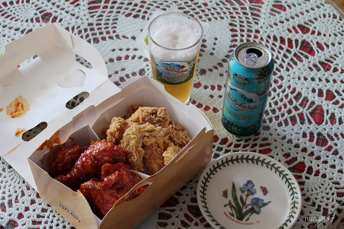 드디어 힘들게 모은 캐시워크 캐시로 치킨 바꿔 먹기 성공 ㅋㅋㅋ BHC 양념반 후라이드반에 코나 빅웨이브