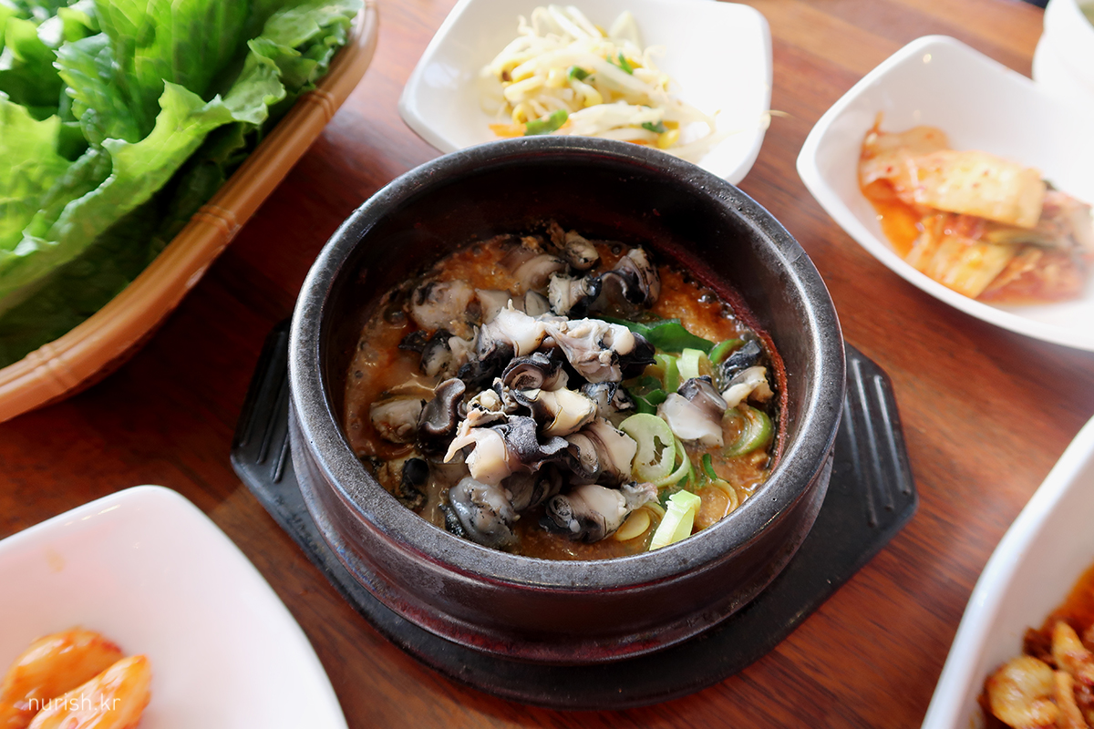 아침 먹으러 잠깐 들렀다. 우렁이쌈장 하나 시키고, 제육볶음 하나 주문