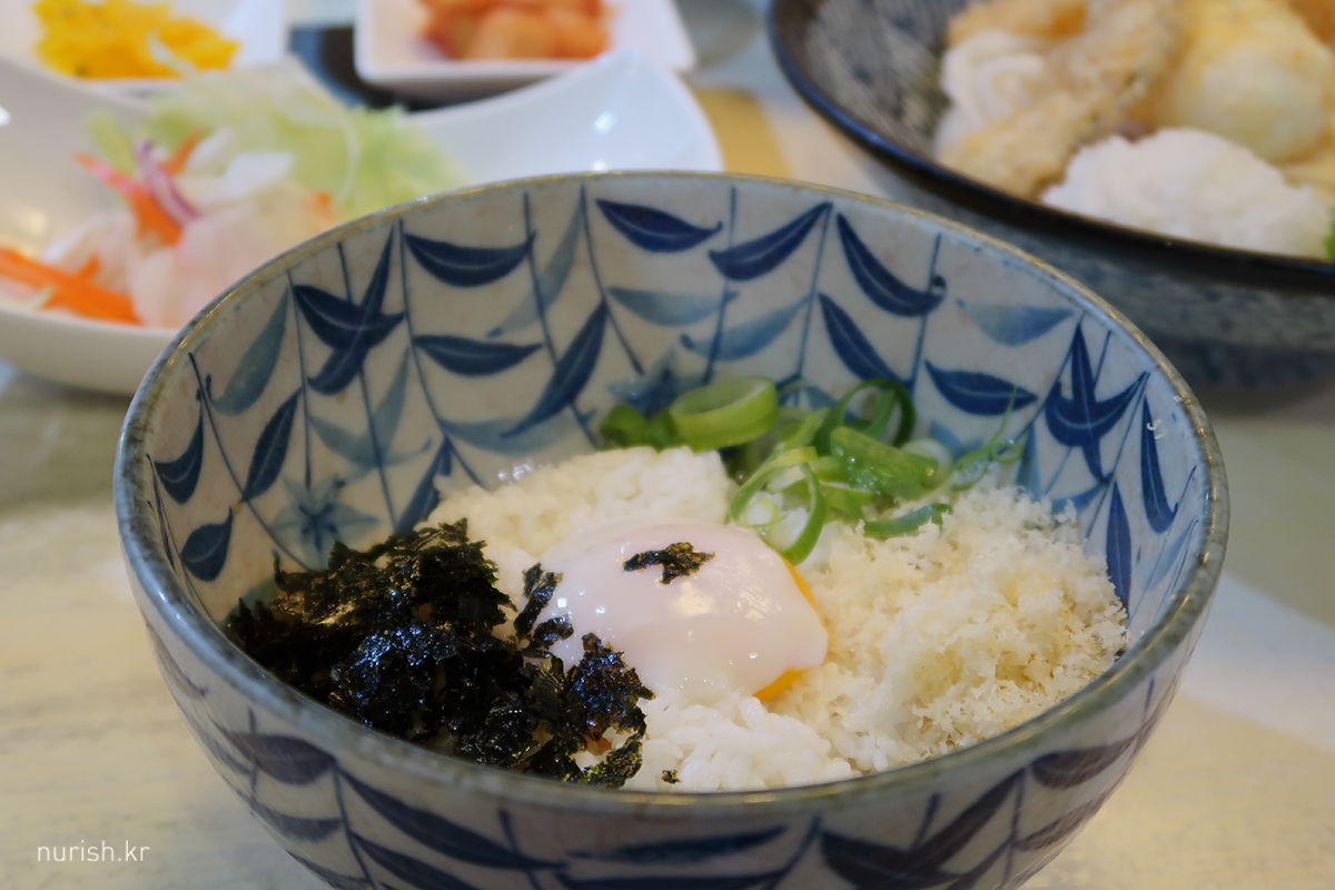 궁금해서 시켜 본 계란밥. 밥 위에 김가루, 튀김가루, 계란 노른자, 파가 있다.