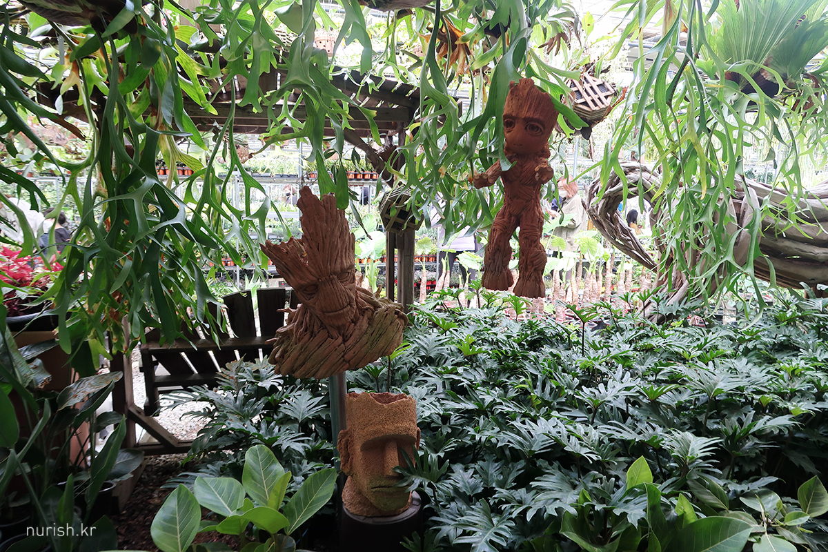 프로방스에서 나와서 다시 자유로 타고 달리다가 낙하IC로 빠져나와 통일로 지나서 차 한 대 들어가는 골목을 흙먼지와 함께 굽이굽이 따라가면 엄청 커다란 화훼농장이 나온다. 들어가는 길은 좁지만 주차장은 넓어서 다행이었다. 식목 시즌인 데다가 주말이라 그른지 차도 사람도 엄청 많았다.