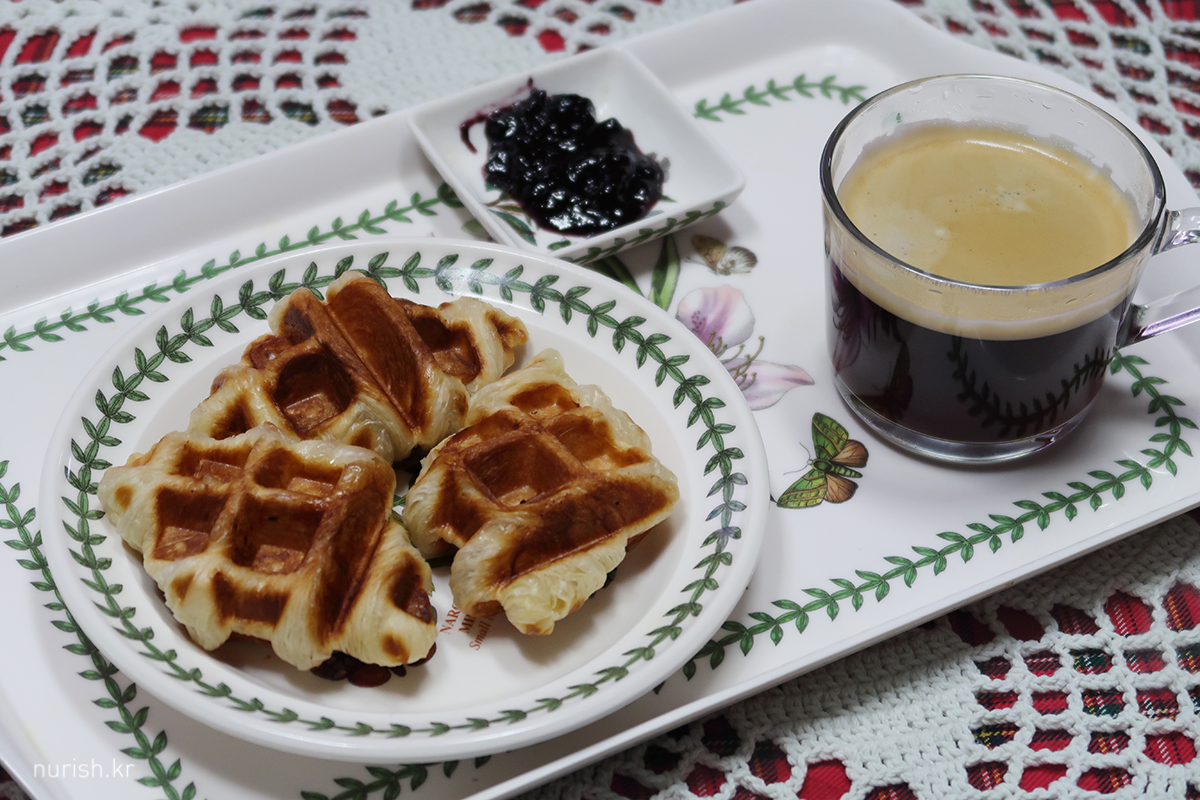 아침은 간단하게 크로플, 블루베리잼, 커피