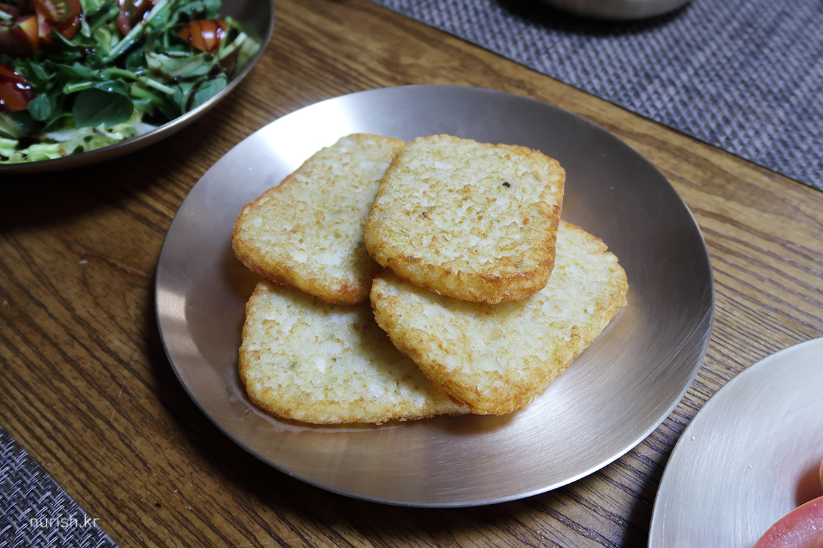 저녁밥은 과천에서 집에 오는 길에 광명에서 들른 코스트코에서 산 해시브라운과 채소들