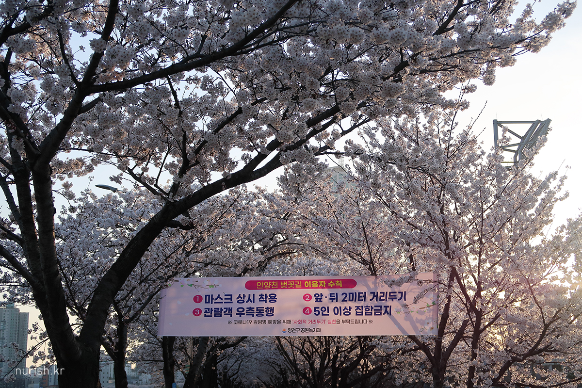 목동교 지나니까 안양천 벚꽃길 이용자 수칙 현수막이 걸려 있다. 꼭 지킬 것.