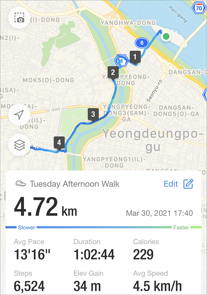 회사에서 출발할 때 GPS 켜는 걸 깜박해서 선유도에서 시작 오목교 마을버스 정류장까지. 근데 운동이라기에는 너무 설렁설렁 걷고 있나..?