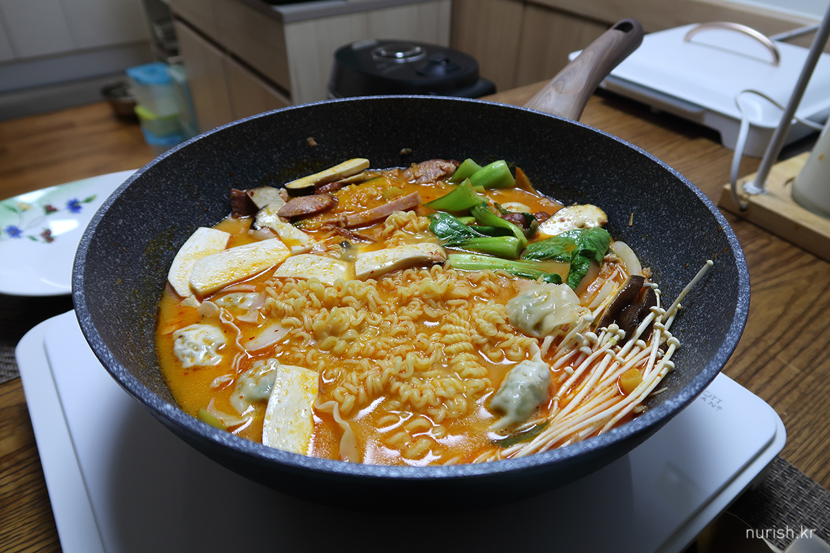 어제 남겨 놓은 존슨빌부대찌개 1/2에 단호박, 치즈, 마늘, 스팸, 각종 버섯들, 라면, 만두, 떡, 청경채 등등. 이틀 연속으로 먹어도 맛있어ㅠㅠ
