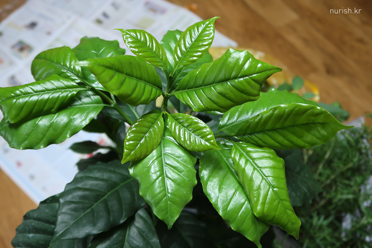 싱그러운 커피 나무. 우리집에 있는 커피 나무의 새 친구