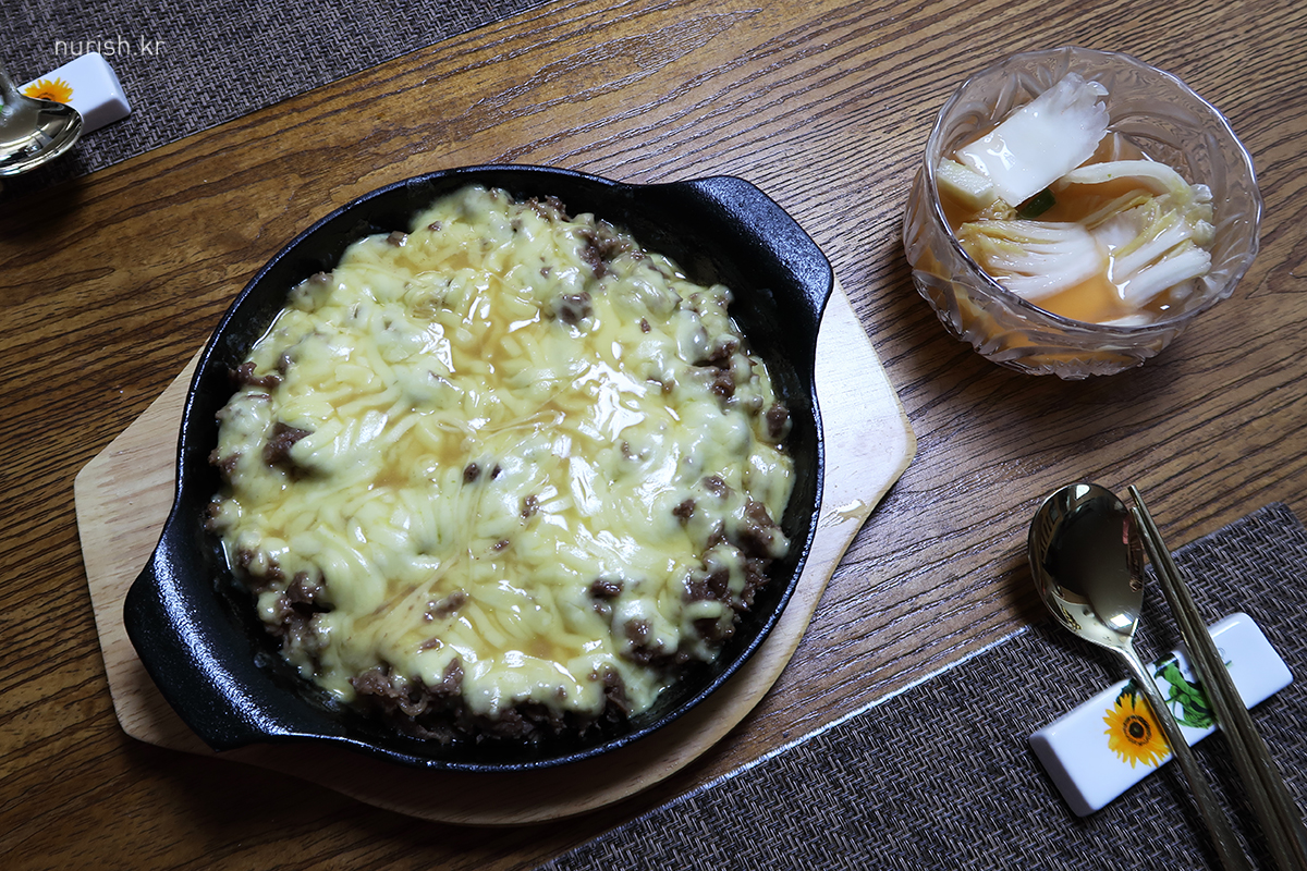 저번에 경주에서 먹고 온 치즈불고기 따라서 엄마가 만들어 준 치즈불고기. 더 바싹 익혔어야 하는데 국물이 많아서 비주얼이 좀 그랬다. 그래도 맛은 있었으니까.
